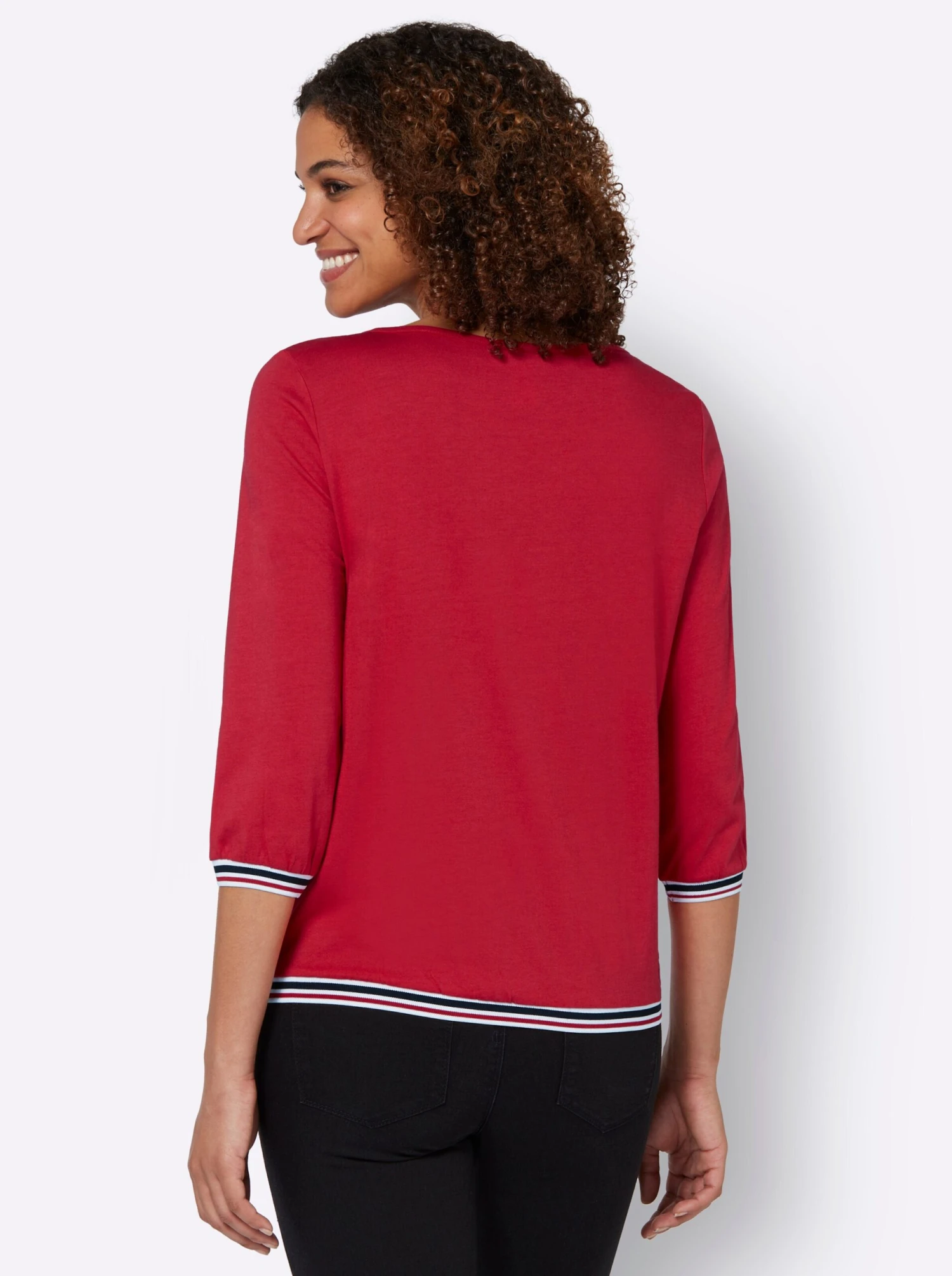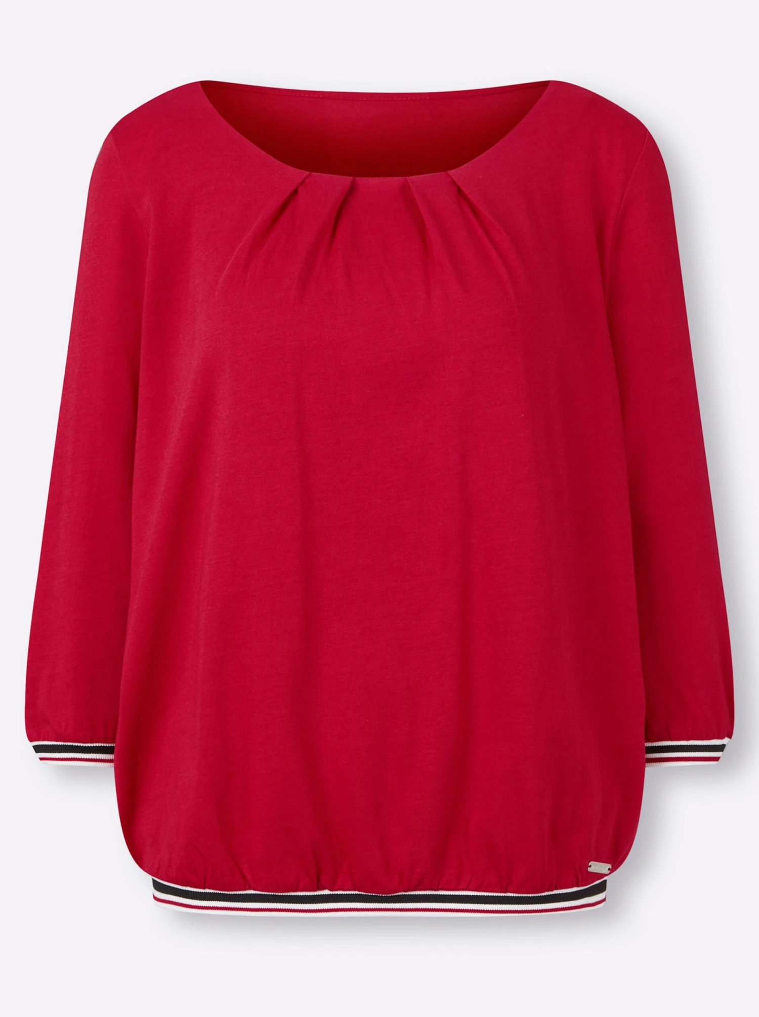 Lässiger Blickfang bei diesem schlichten Shirt sind die gestreiften Rippbündchen an den Abschlüssen. Fällt schön locker dank der eingelegten Falten am Rundhals-Ausschnitt. 3/4-lange Ärmel. Besonders hautsympathisch, aus nach OCS-Standard zertifizierter Bio-Baumwolle.