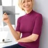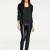 Angenehm weiches Shirt in Rippenoptik mit aufgesetztem Glitzerband vorne am Ausschnitt, an der imitierten Knopfleiste, an der Brusttasche und innen an den Seitenschlitzen. Riegel am fixierten Aufschlag der 3/4-Ärmel ebenfalls in Glitzeroptik.