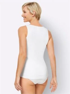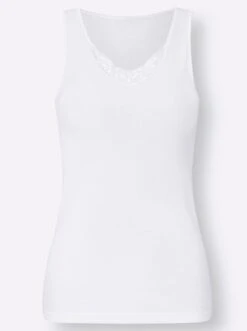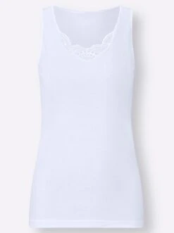 Achselhemd in der 2-Stück-Packung von wäschepur. Mit zwei verschiedenen, schönen Batist-Motiven und Satin-Paspelierung. Das Rückenteil ist leicht verlängert. Weicher Feinripp. OCS-zertifiziert.