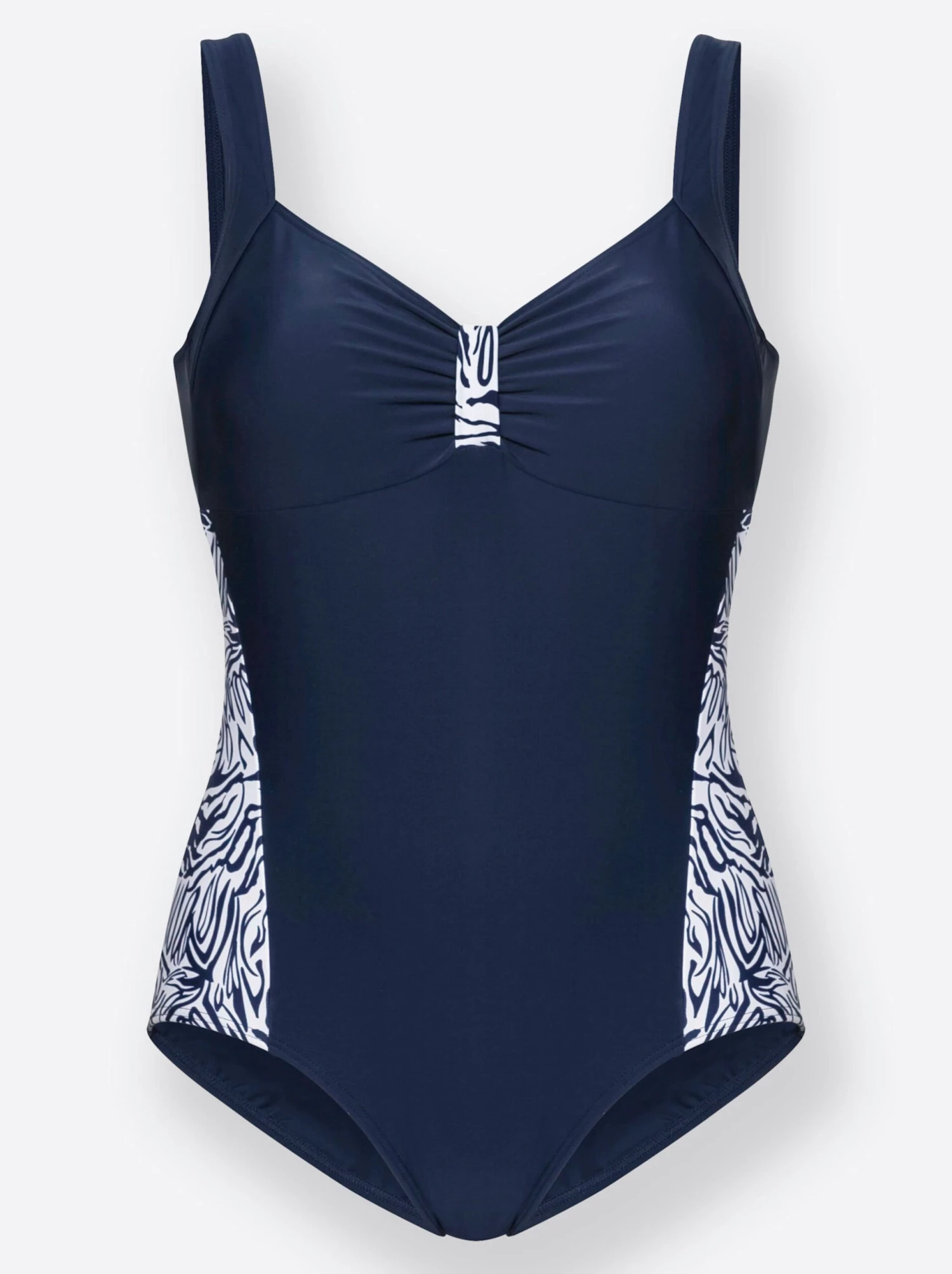 Die seitlichen Einsätze im Zebra-Muster setzen tolle Akzente – ansonsten zeigt sich der Badeanzug sehr elegant in Uni mit V-Ausschnitt, Soft-Cups mit Raffungen, Unterbrustband und geschickt platzierten Teilungsnähten vorne. Komplett gefüttertes Vorderteil. Runder Rückenausschnitt.