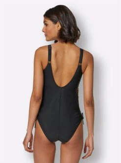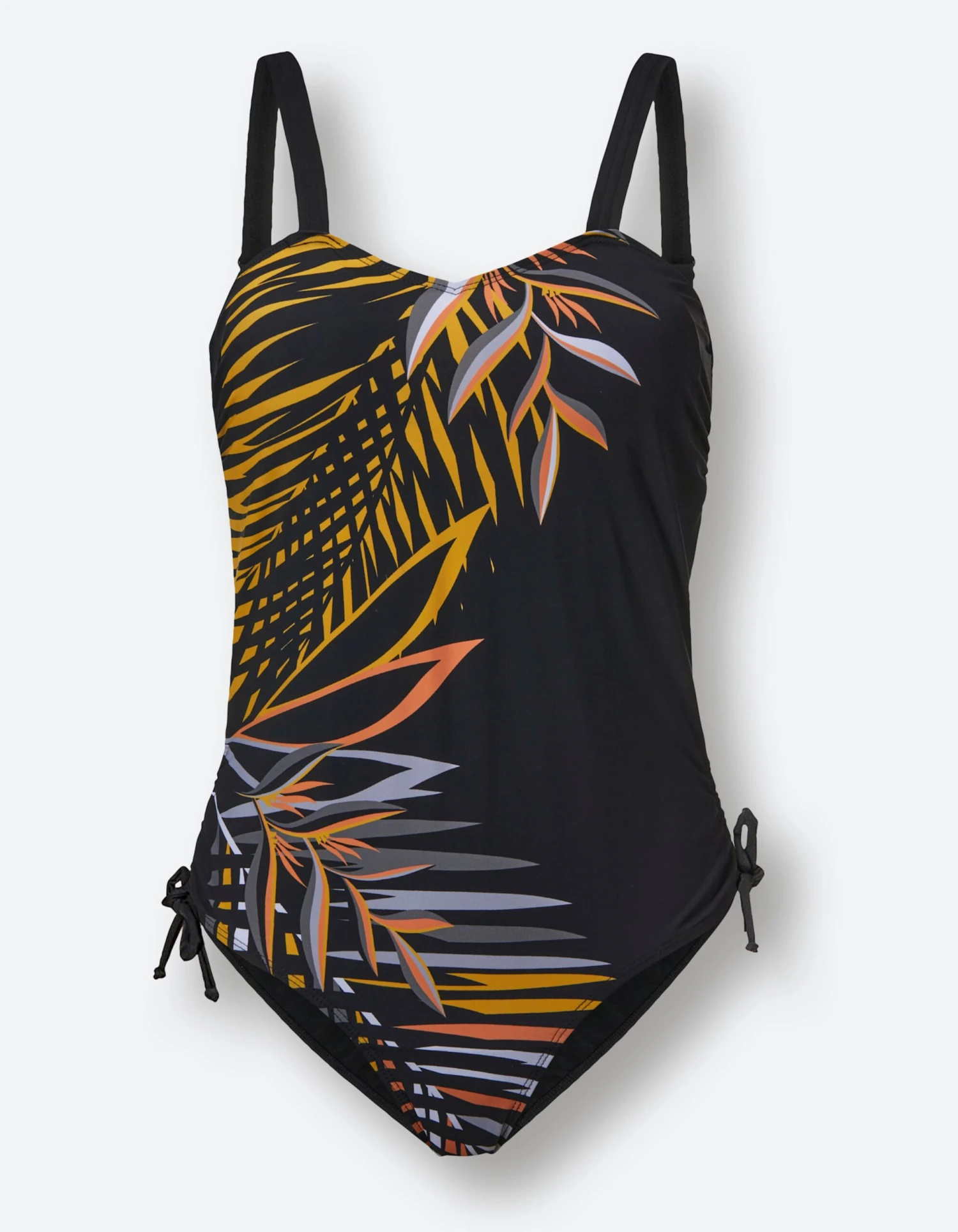 Badeanzug in Top-Form! Durch die Vollkorsage mit Shaping-Effekt zaubert er eine attraktive Silhouette. Mit platziertem Druckmuster, breiten verstellbaren Trägern und Softcups. Bändchen am Beinausschnitten, so können diese leicht gerafft werden. Runder Rückenausschnitt.