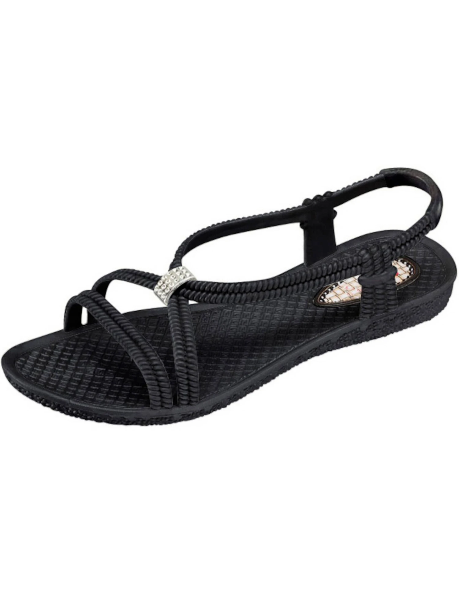 Raffiniert gestaltete Badesandale mit Zier-Applikationen. Super bequem durch die elastischen Bändchen und die flexible Laufsohle. Fällt kleiner aus, bitte eine Nummer größer bestellen.