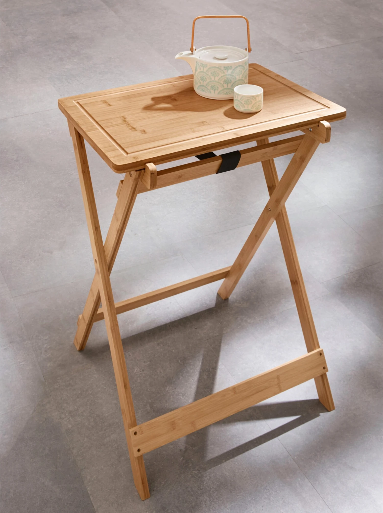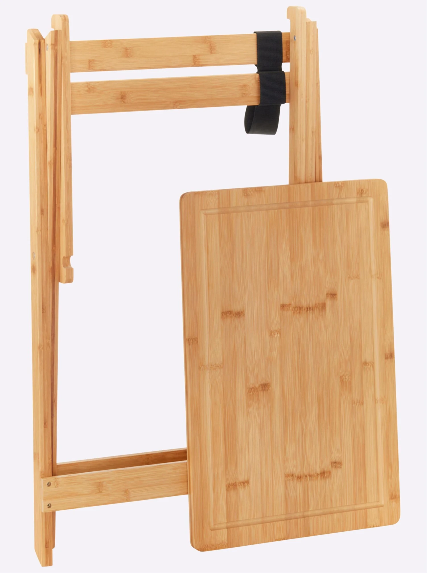 Beistelltisch Praktischer Beistelltisch für drinnen und draußen. Ideal beim Grillen, im Garten oder am Esstisch. Aus massivem Bambus. Platzsparend und einfach zusammenklappbar. Die Tischplatte ist abnehmbar und als Servierplatte verwendbar, B/T ca. 60/40 cm.