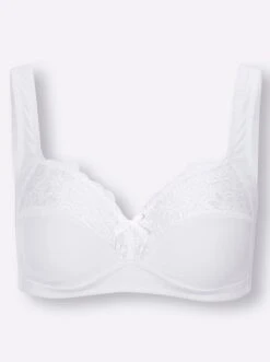 Wunderschöne, florale Blütenspitze an den Obercups macht diesen BH ohne Bügel von wäschepur so besonders. 2-geteilte Cups und im Rücken verstellbare Träger.