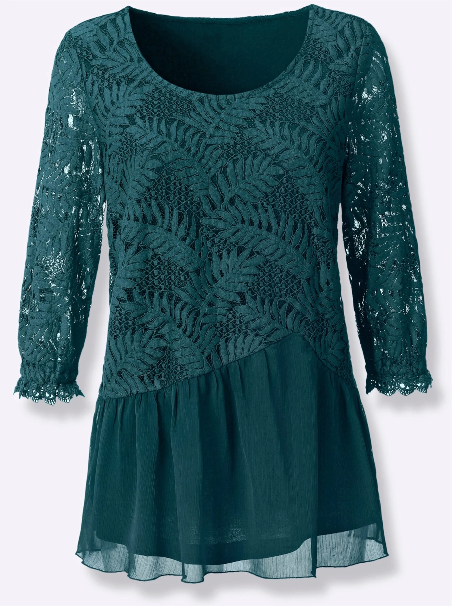 Sieht einfach fantastisch aus! Romantische Bluse aus Spitze und Chiffon. Oberteil aus Spitze. Brustabnäher. 3/4-lange Spitzenärmel mit Gummizug und Bordüre am Abschluss. Am asymmetrischen Saumabschluss ist ein leicht gerafftes Chiffonteil angesetzt. Weiches Jersey-Futter.