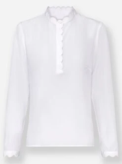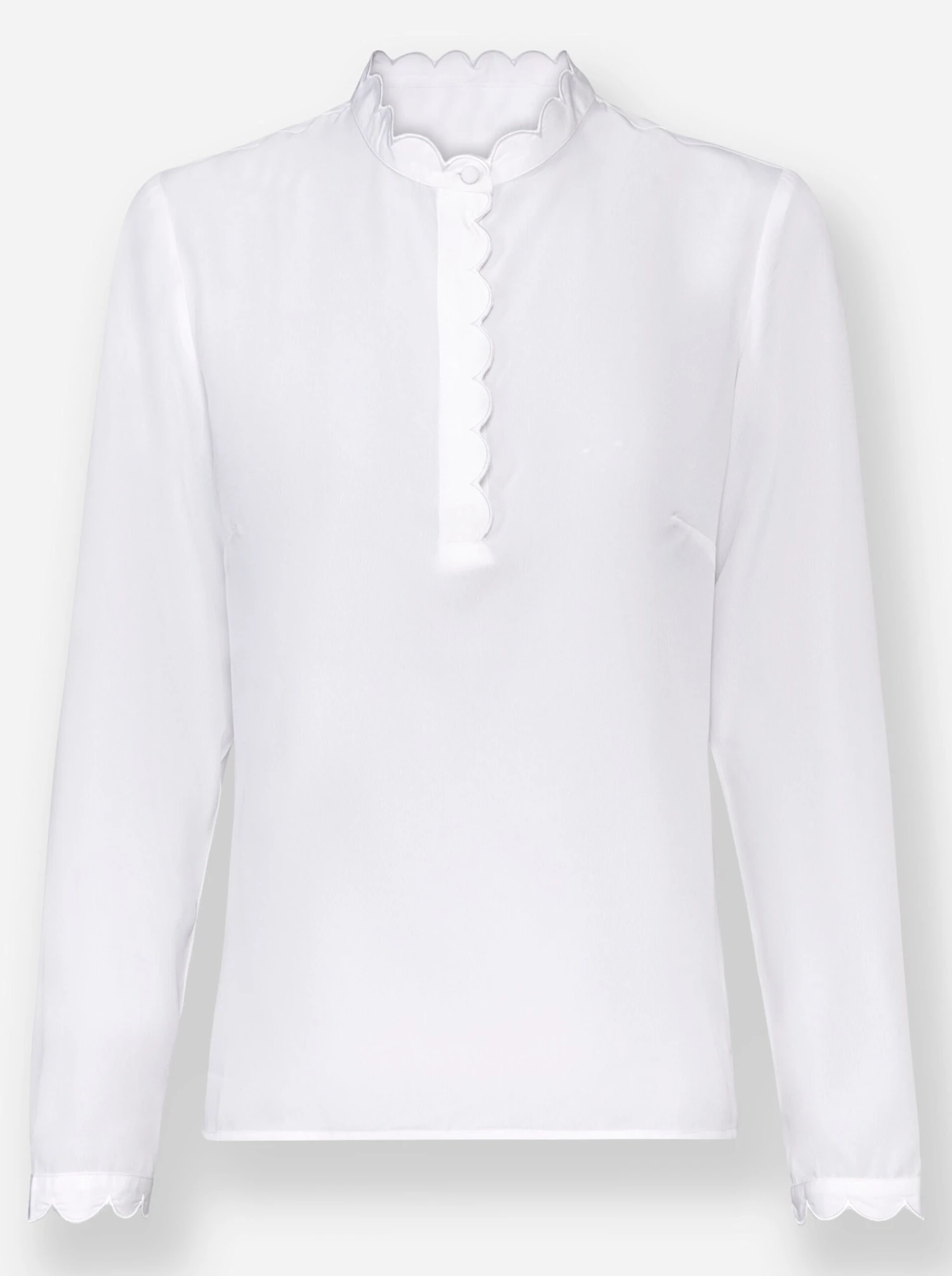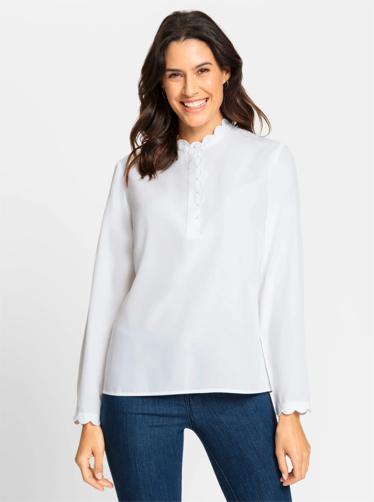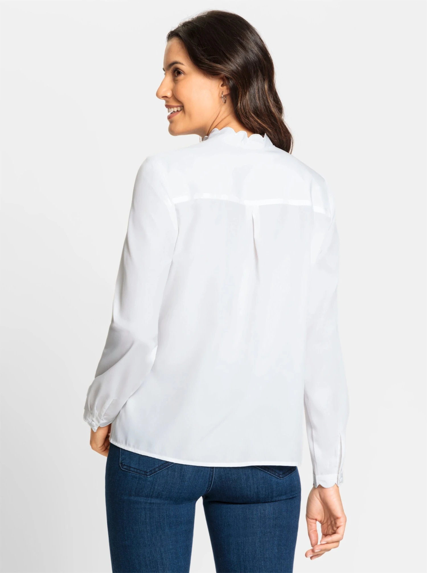 Ob elegant kombiniert oder zur lässigen Jeans – diese Bluse ist wunderbar vielseitig und immer eine gute Wahl. Für das gewisse Etwas sorgt der gewellte Abschluss am schmalen Stehkragen mit 1 stoffüberzogenen Knopf, an der die kurze Knopfleiste verdeckenden Blende und an den schmalen Knopfmanschetten mit stoffüberzogenen Knöpfen am Abschluss der langen Ärmel. Mit Brustabnähern sowie Weite gebender Falte an der Rückenpasse. Pflegeleichte, dezent transparente Qualität.