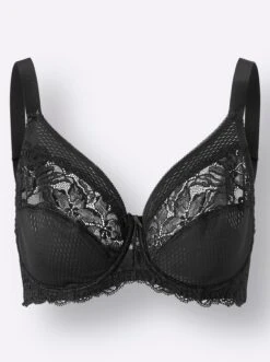 Der BH mit Bügel von wäschepur kombiniert gekonnt die florale Spitze an den Obercups mit dem bezaubernden Jacquardmuster. 2-geteilte Cups und im Rücken verstellbare Träger.