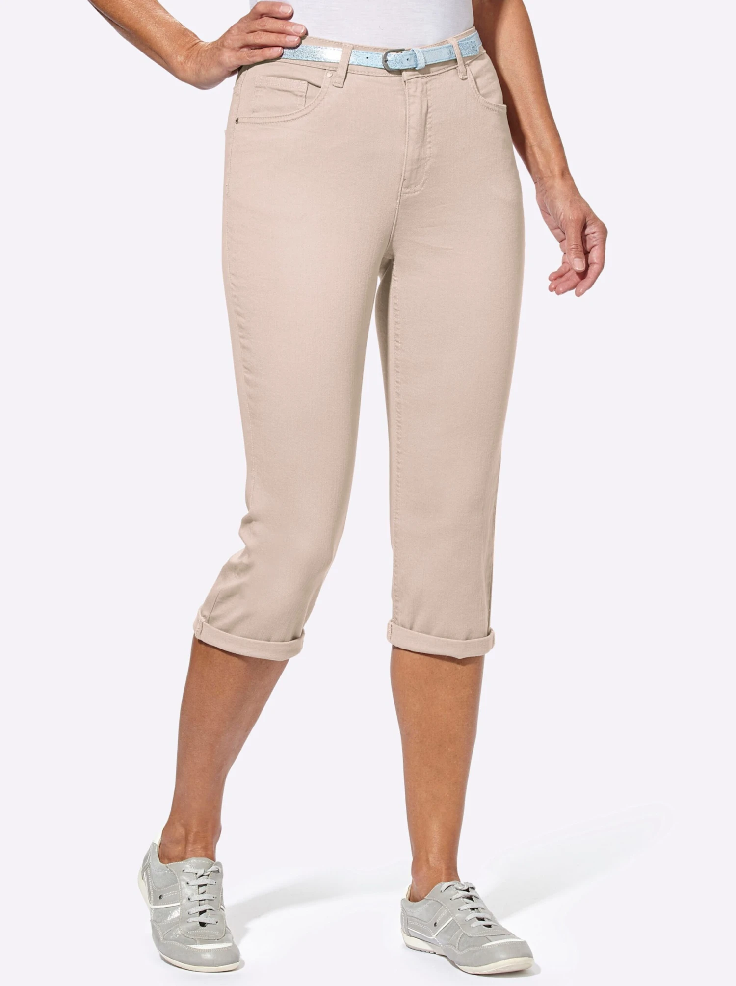 Gemütliche Capri-Hose in stretchbequemer Qualität. Den modischen Gürtel dürfen Sie beim Kauf der Hose behalten! In der typischen 5-Pocket-Form mit Formbund, Gürtelschlaufen sowie Knopf- und Reißverschluss vorne. Fixierter Beinaufschlag. Fußweite ca. 39 cm. Inklusive Gürtel.