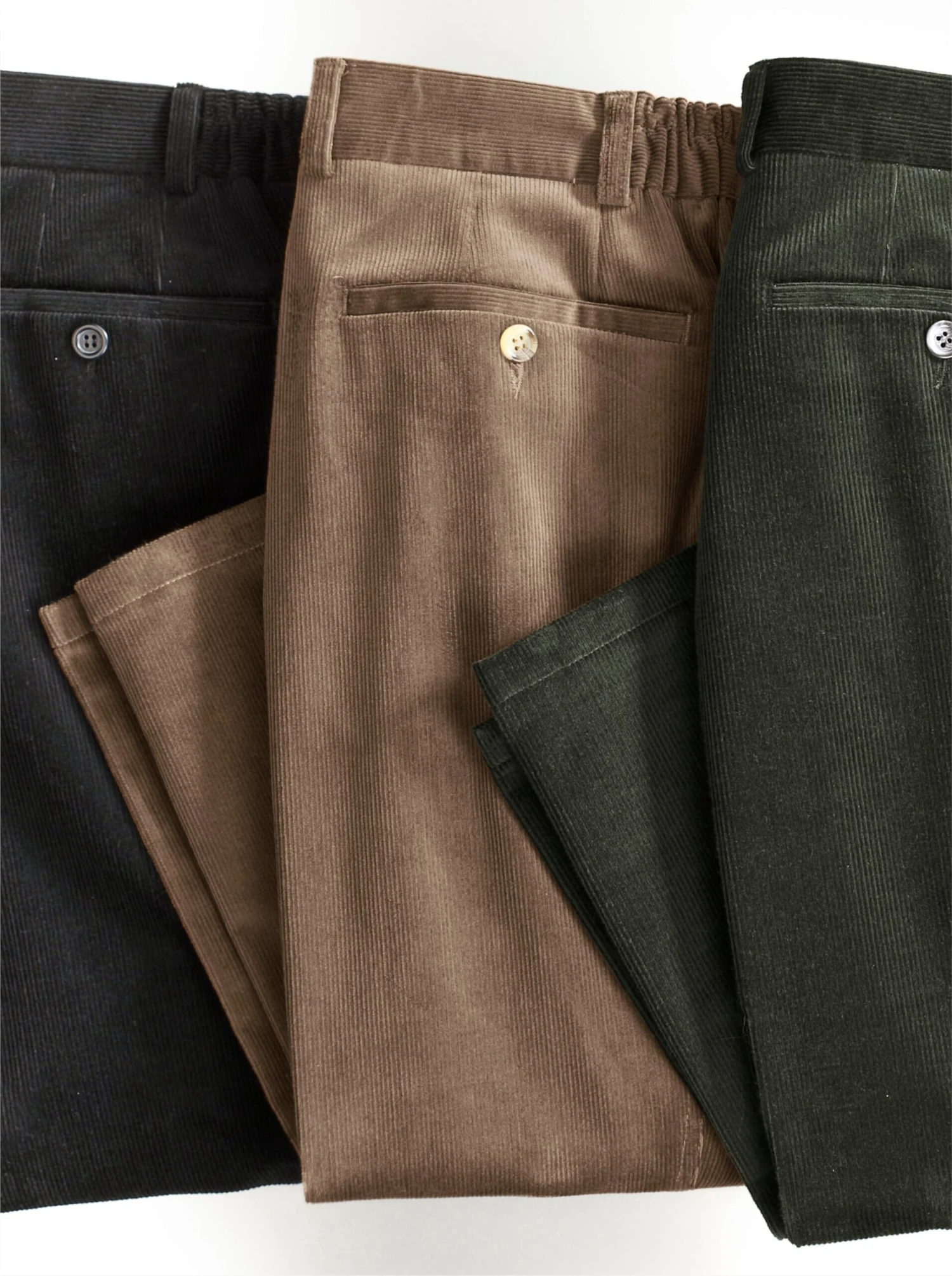 Cord-Hose mit konfektioniertem Bund mit Gürtelschlaufen, Knopf- und Reißverschluss sowie zusätzlichem Hakenverschluss. Seitliche Dehnbund-Einsätze sorgen für Komfort. 2 seitliche Taschen. Rückteil mit formgebenden Abnähern und 2 Paspeltaschen mit Knopf.