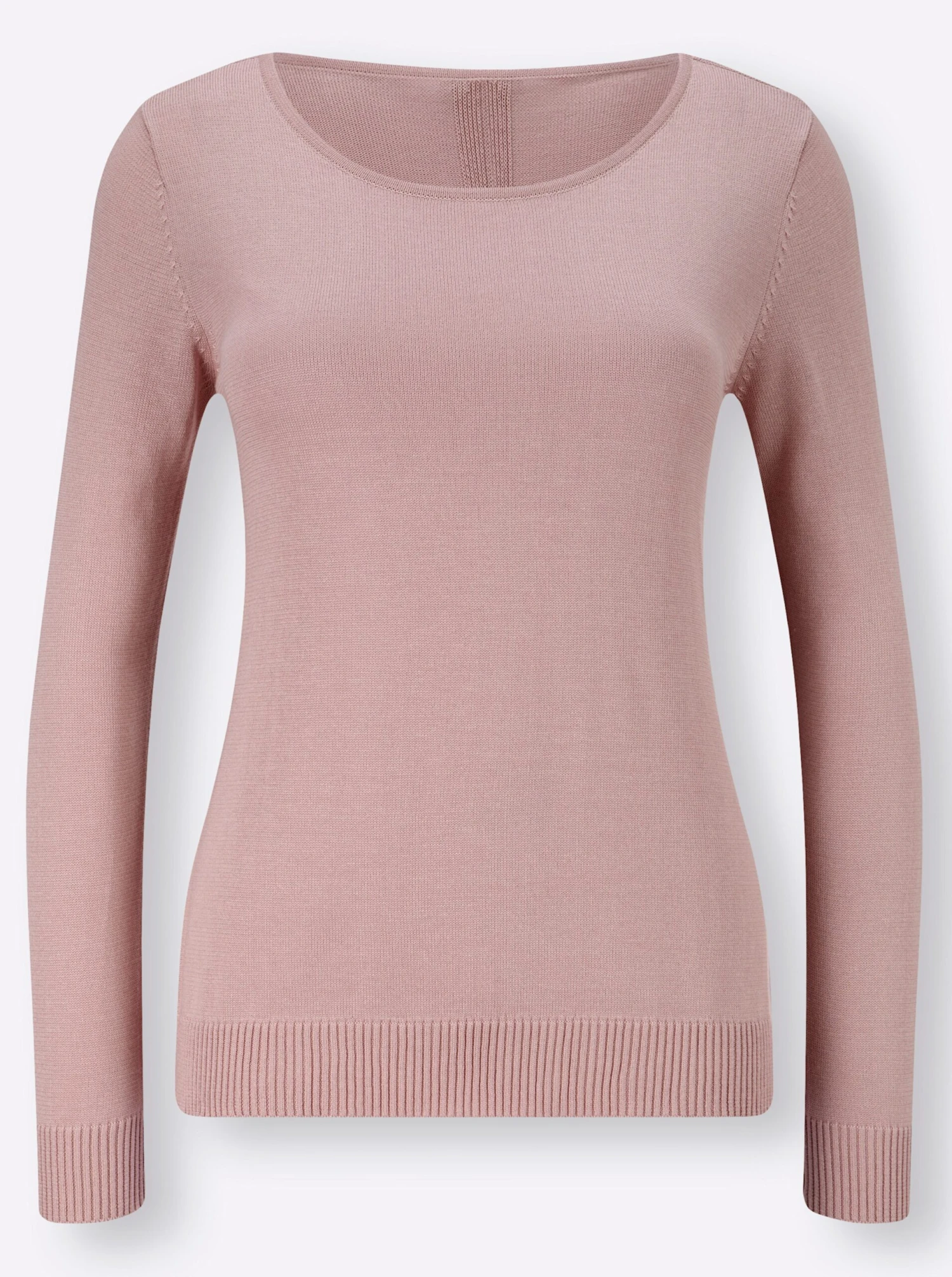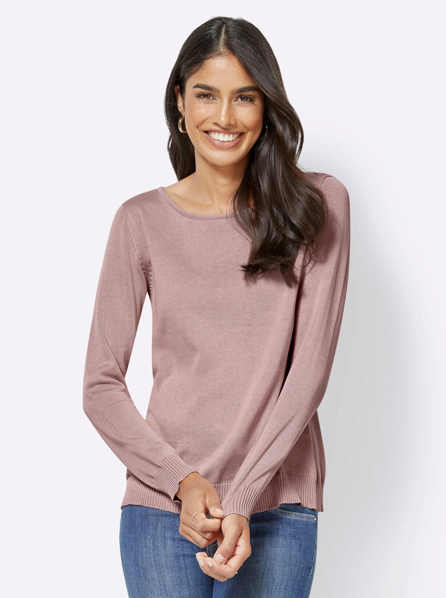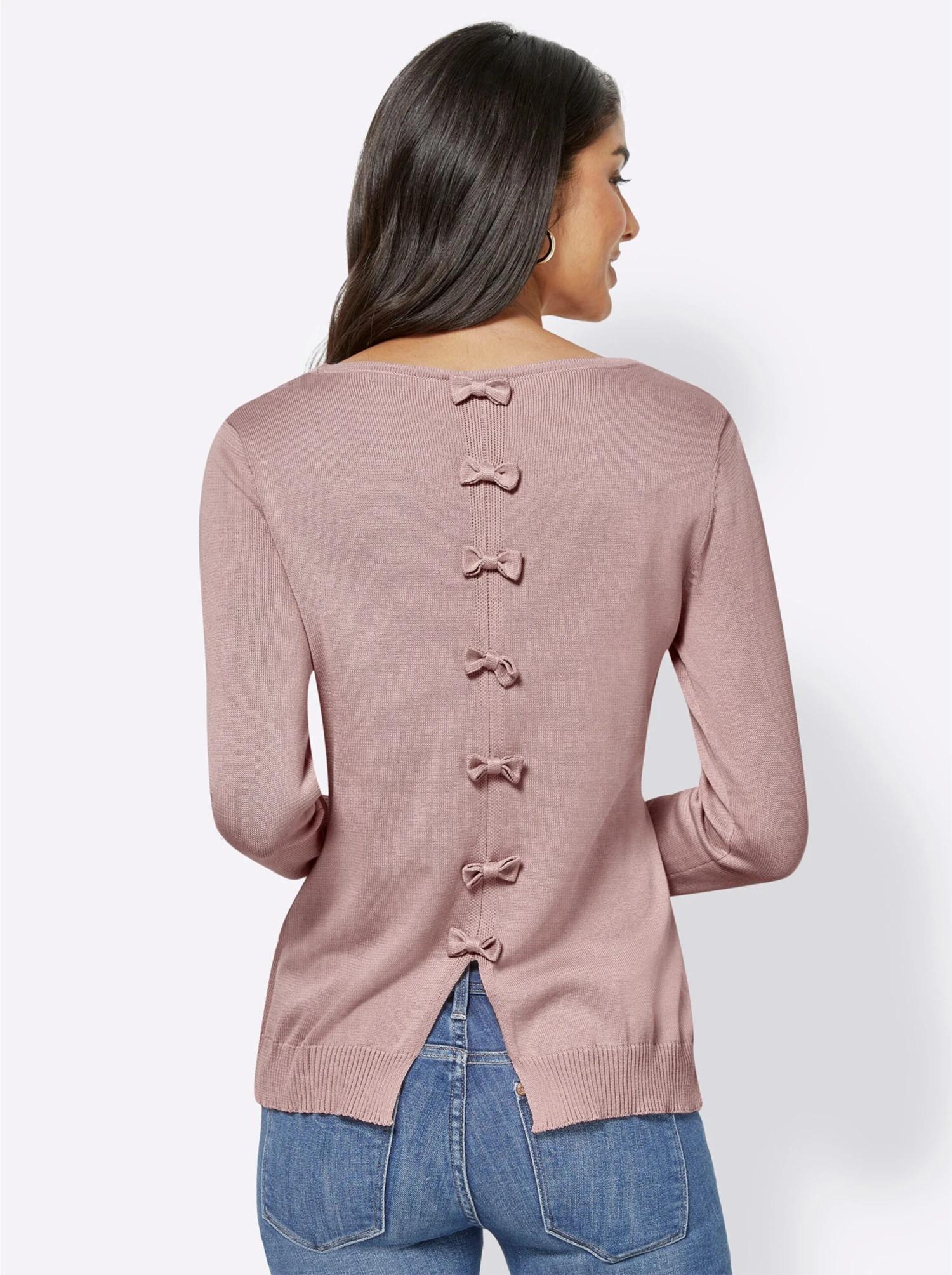 Bei diesem Pullover weiß auch der Rücken zu entzücken. Denn er ist mit kleinen Zierschleifen über die ganze Mitte geschmückt und endet mit einem Schlitz. Er zeigt sich in geschmeidigem Feinstrick mit dezentem Glanz und Rippbündchen an Ärmeln und Saum. Aufwändig passformgerecht gearbeitet.