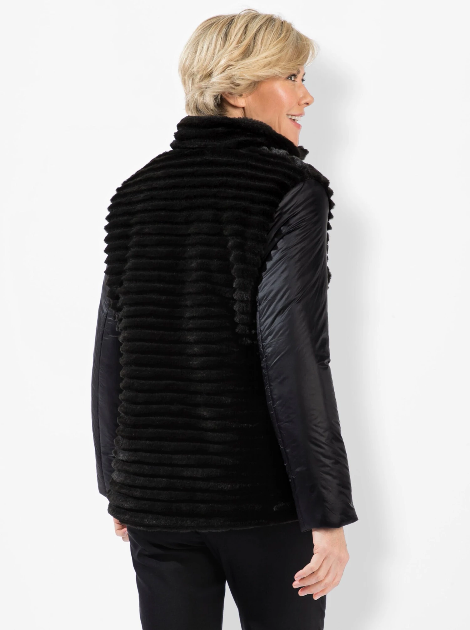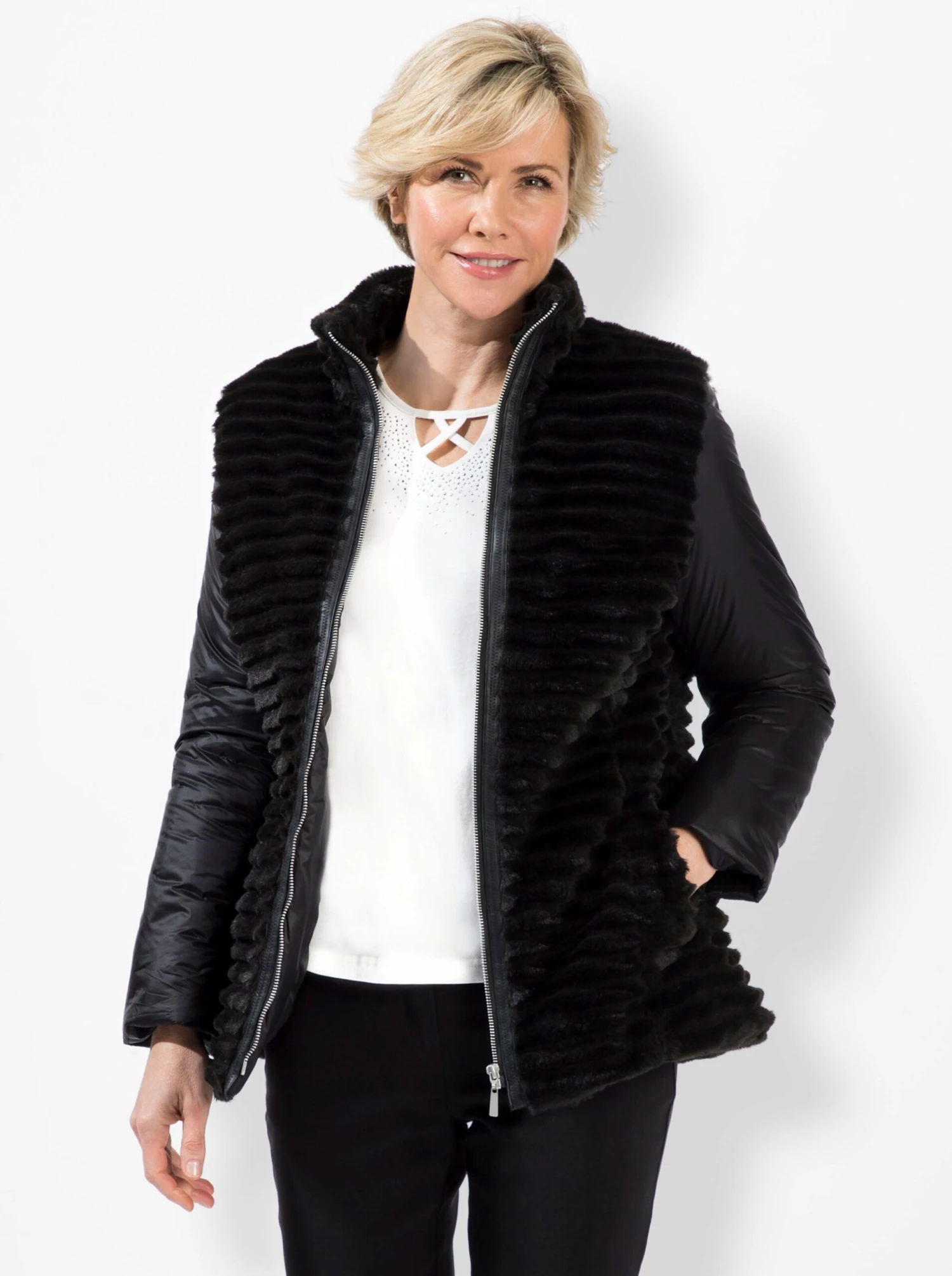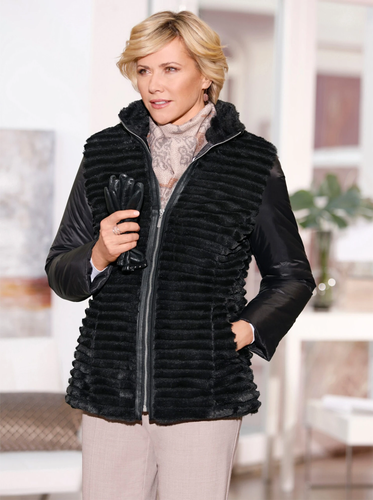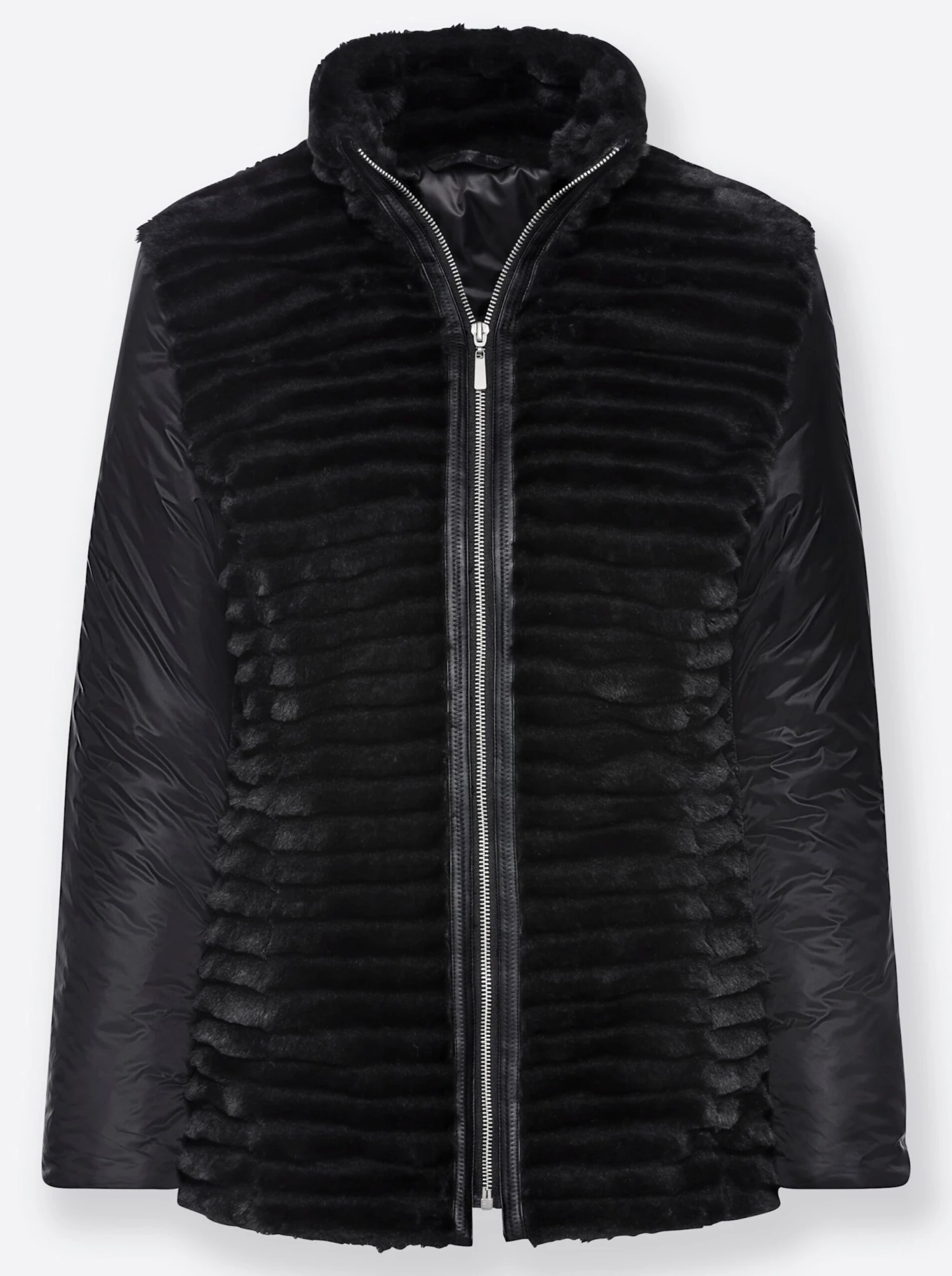 Jacke – ein echter Hingucker in wärmender Qualität. Flauschiger Rumpf aus Pelz-Imitat mit Paspel in Leder-Optik am Reißverschluss und an den Taschen. Weicher Innenkragen. Formende Nähte vorne und hinten. 1 knöpfbare Sicherheits-Innentasche.