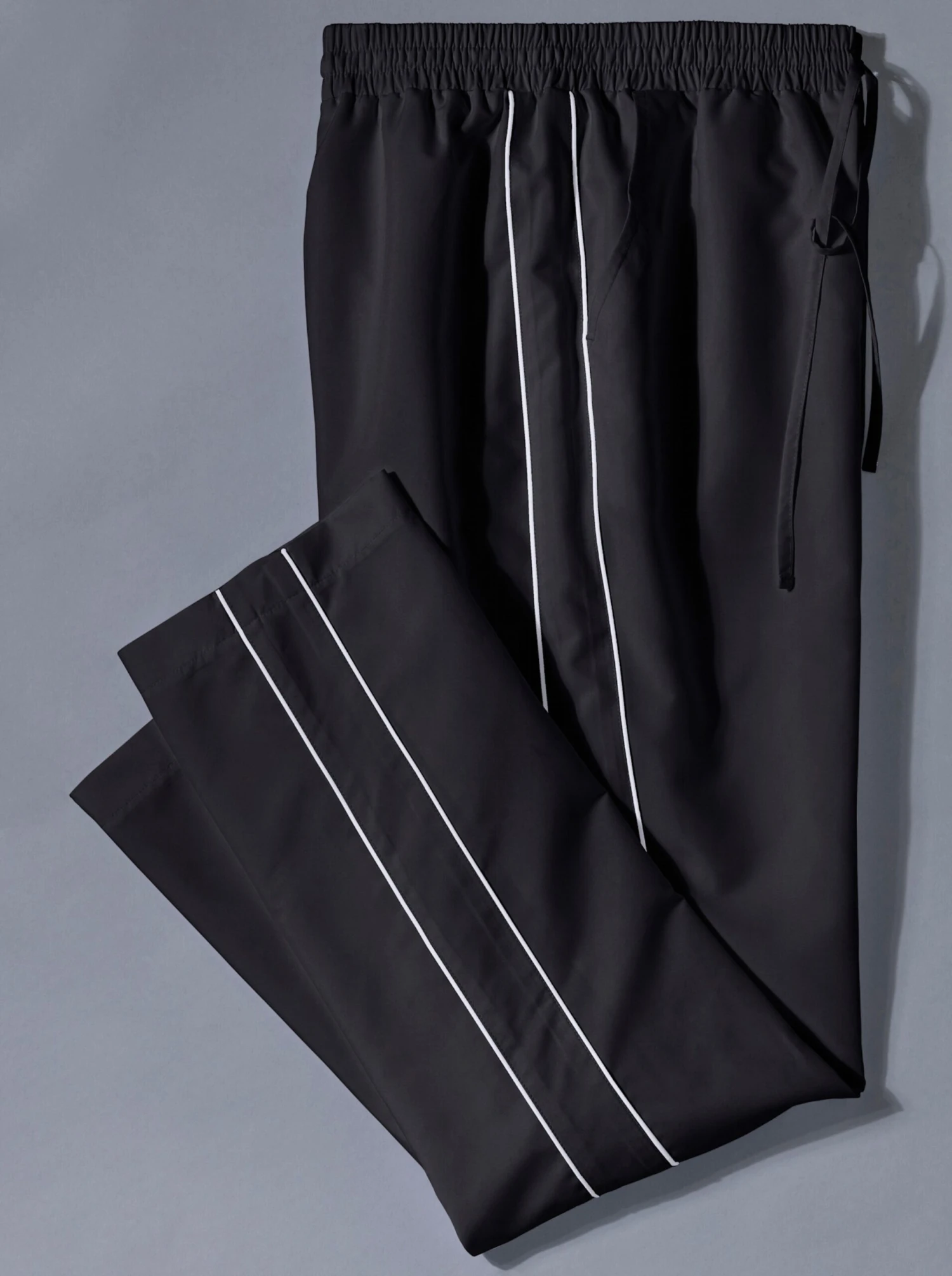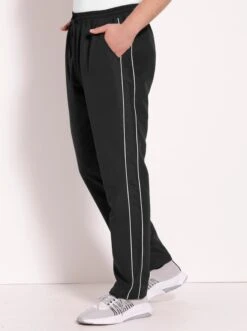 Freizeithose in pflegeleichter Microfaser-Qualität. Schön figurfreundlich, da die Kontrastpaspeln an den Seiten optisch streckend wirken. Bequemer Rundum-Dehnbund mit Bindeband. 2 seitliche Taschen.