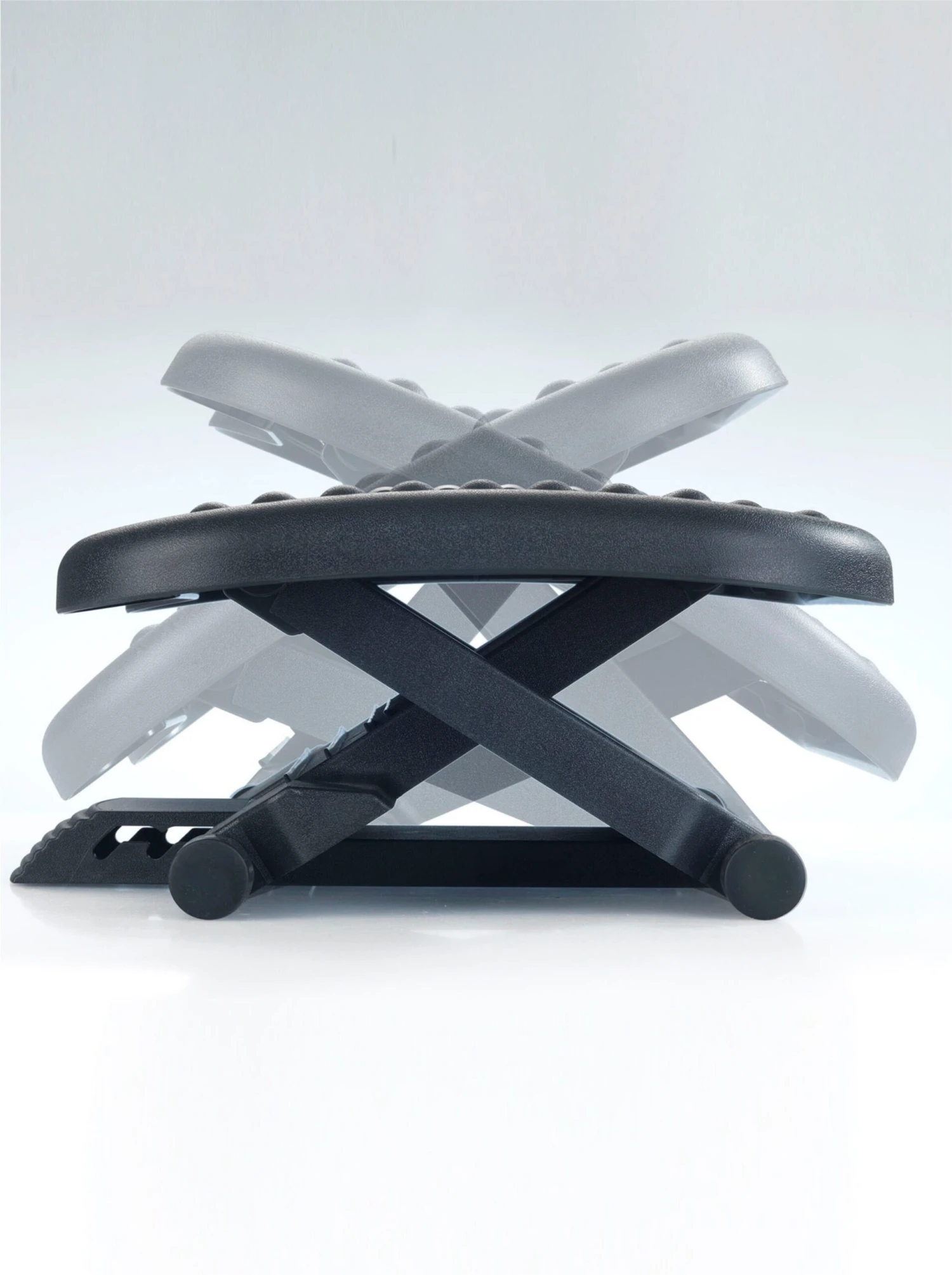 3-in-1 Fußstütze mit angenehmer Massagerolle und integrierter Wipp-Funktion. Perfekt für zuhause oder Büro. 3-fach höhenverstellbar und mit einem einstellbaren Neigungswinkel zwischen 0-30 Grad. Beschichtete Unterseite. Große, ergonomisch geformte Trittfläche. Maße Trittfläche ca. 44×33,5 cm. Höhe von 11-17 cm verstellbar.
