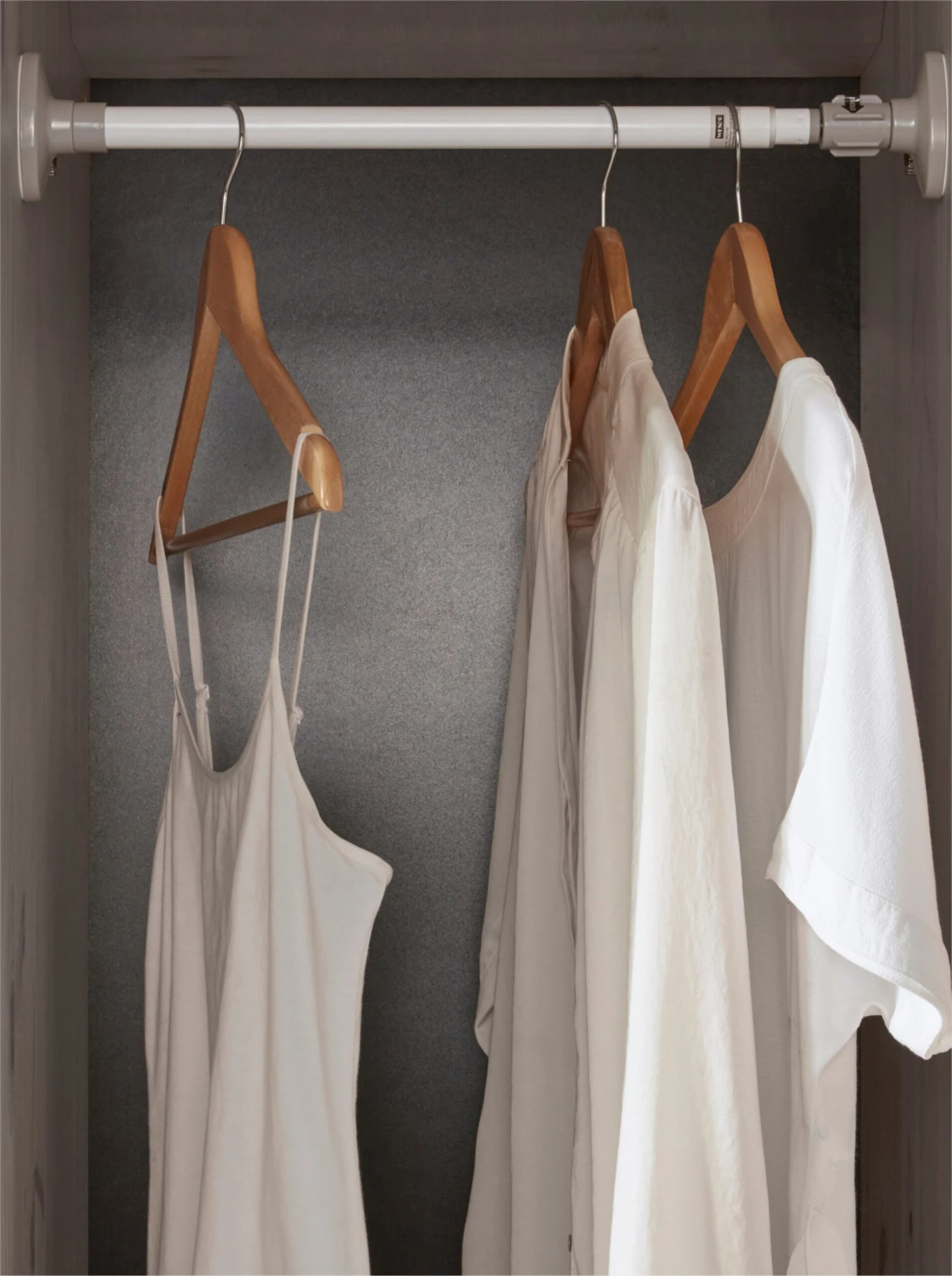 Garderobe Aus Metall, pulverbeschichtet. Teleskop-Kleiderstange zum Einklemmen in Schränke, Wandnischen oder Türrahmen. Stufenlos einstellbar. Anti-Rutsch-Kappen verhindern das Abgleiten.