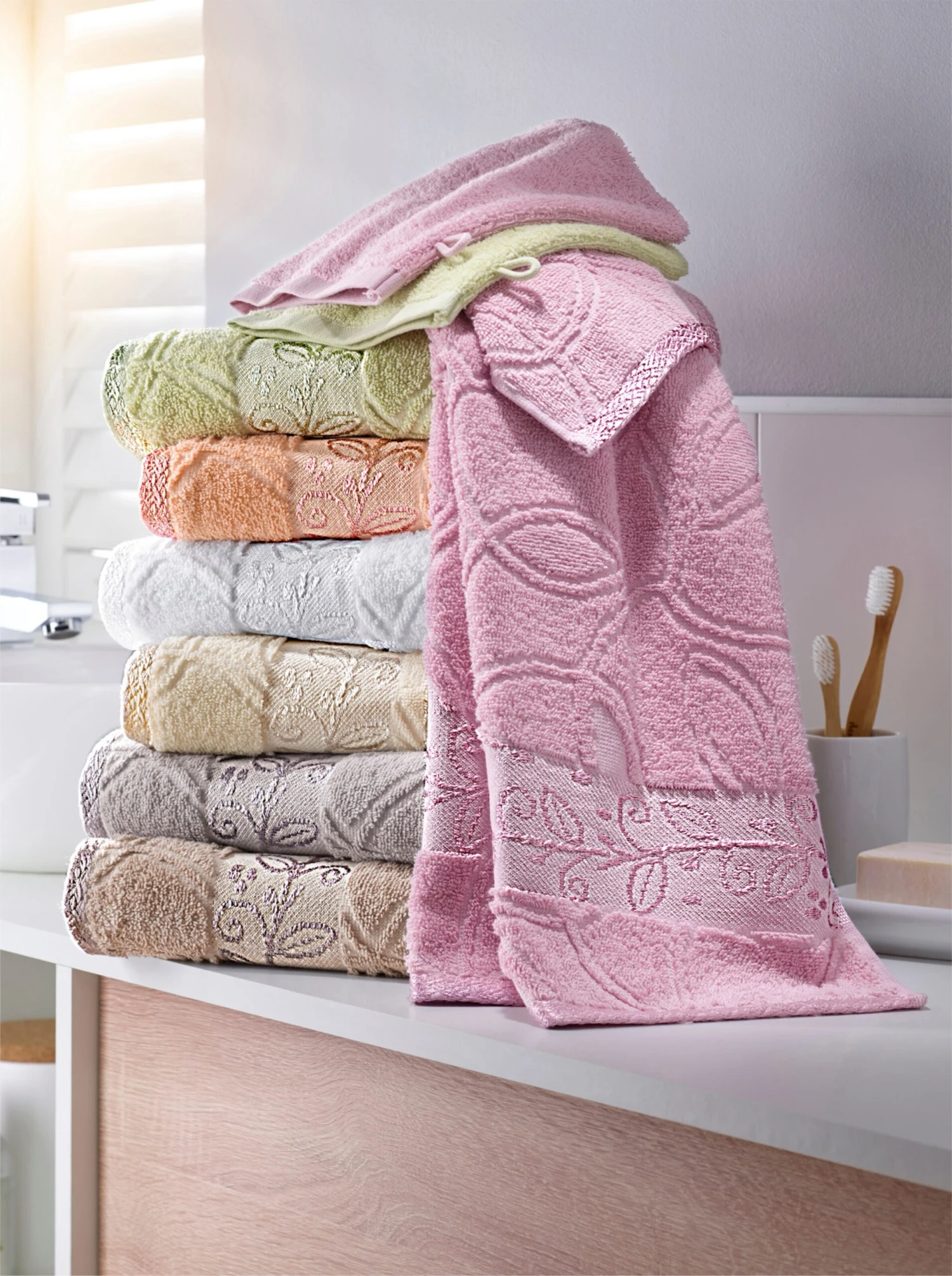 Im attraktiven Rankendessin: Frottierprogramm mit breiter, floraler Bordüre. Flauschiger Walkfrottier. Hochwertige Luxus-Qualität.