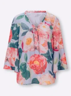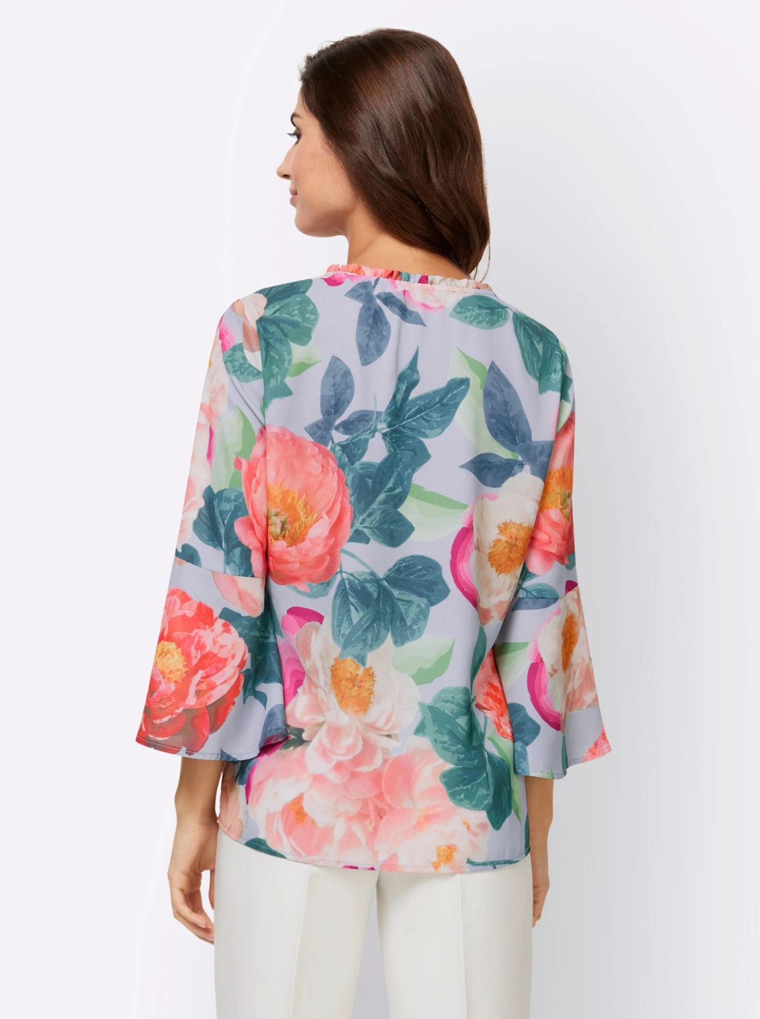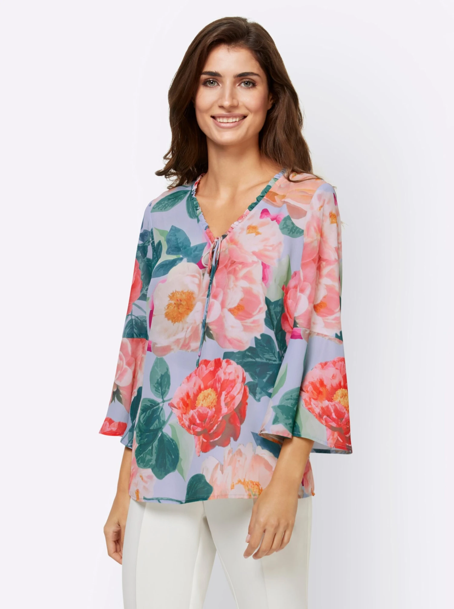 Druckbluse Im opulenten Blüten-Dessin. Mit romantischen 3/4-Volantärmeln, am V-Ausschnitt mit Rüschen und Bindeband. In schmeichelnder A-Form. Leicht transparenter Chiffon in pflegeleichter Crêpe-Qualität.