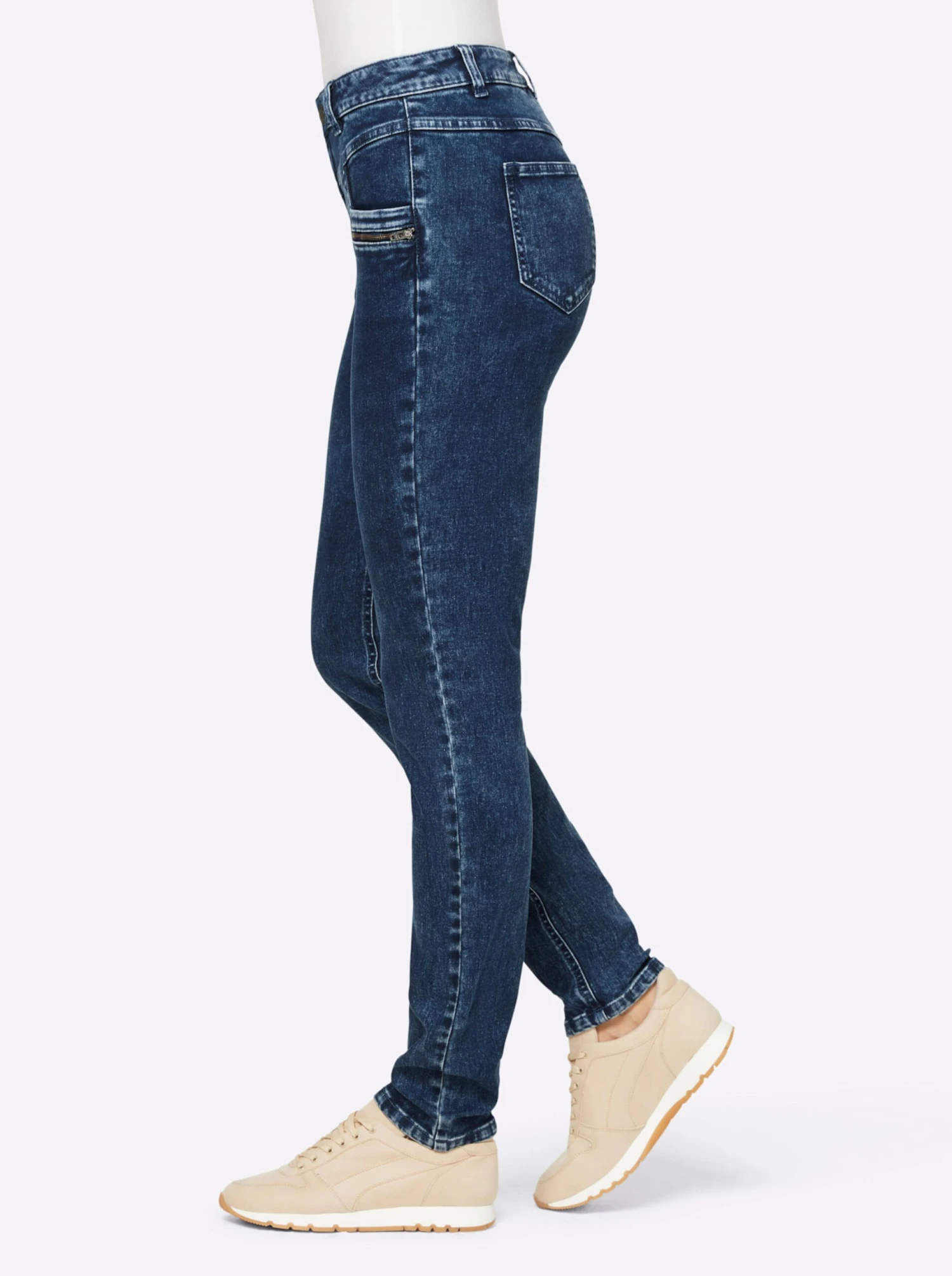 Jeans Perfekt sitzender Style mit Formbund und trendstarken Zipperdetails. Verdeckter Reißverschluss mit Knopfverschluss. Eingrifftaschen und Fake-Zippertaschen vorn, Gesäßtaschen. Fußweite ca. 32 cm. Unterstützt die Initiative Cotton made in Africa.