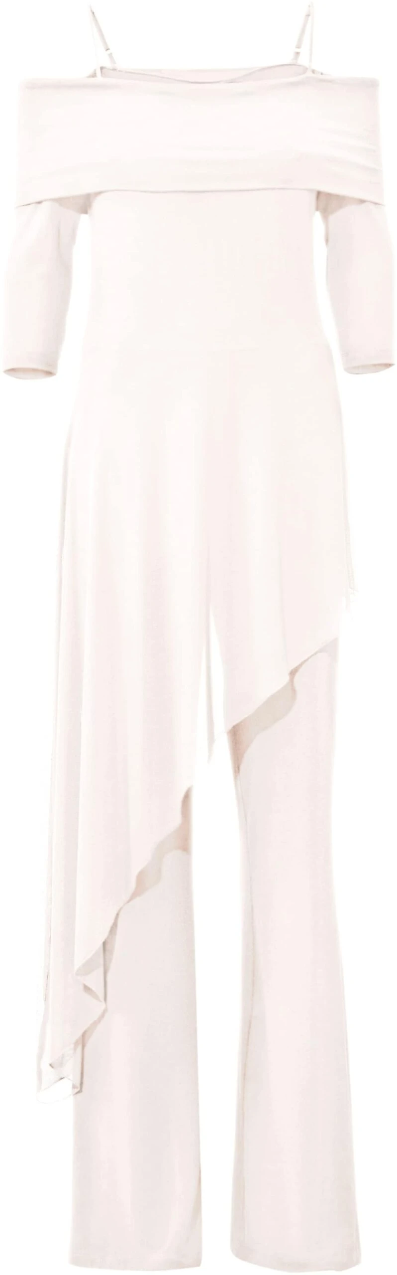 Overall Exklusives Mode-Highlight in edel glänzender, elastischer Qualität. Figurbetontes Oberteil mit raffiniertem Umschlag am Carmenausschnitt, verstellbaren Spaghettiträgern und 3/4-Arm. Weites Bein mit transparentem Netz-Cacheur. Normale Leibhöhe.