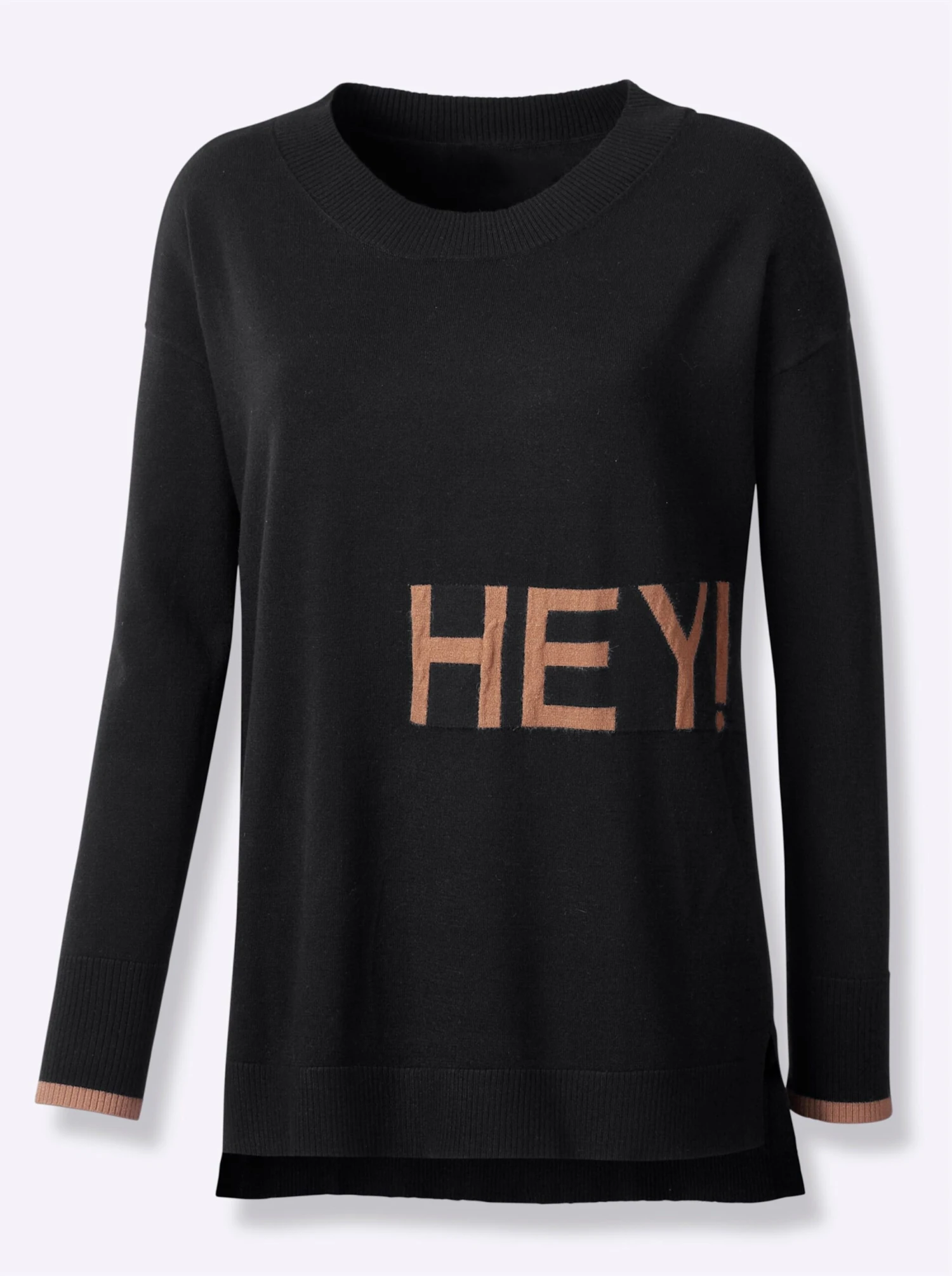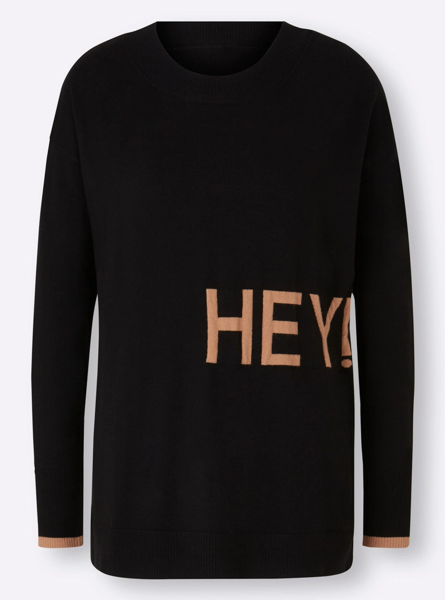 Pullover Up-to-date mit Schriftzug „HEY“ im Vorderteil und trendigen Kontraststreifen am Langarm. Mit Rundhalsausschnitt, überschnittener Schulter, Rippenbündchen und Seitenschlitzen. Hinten etwas länger. Softer Feinstrick.