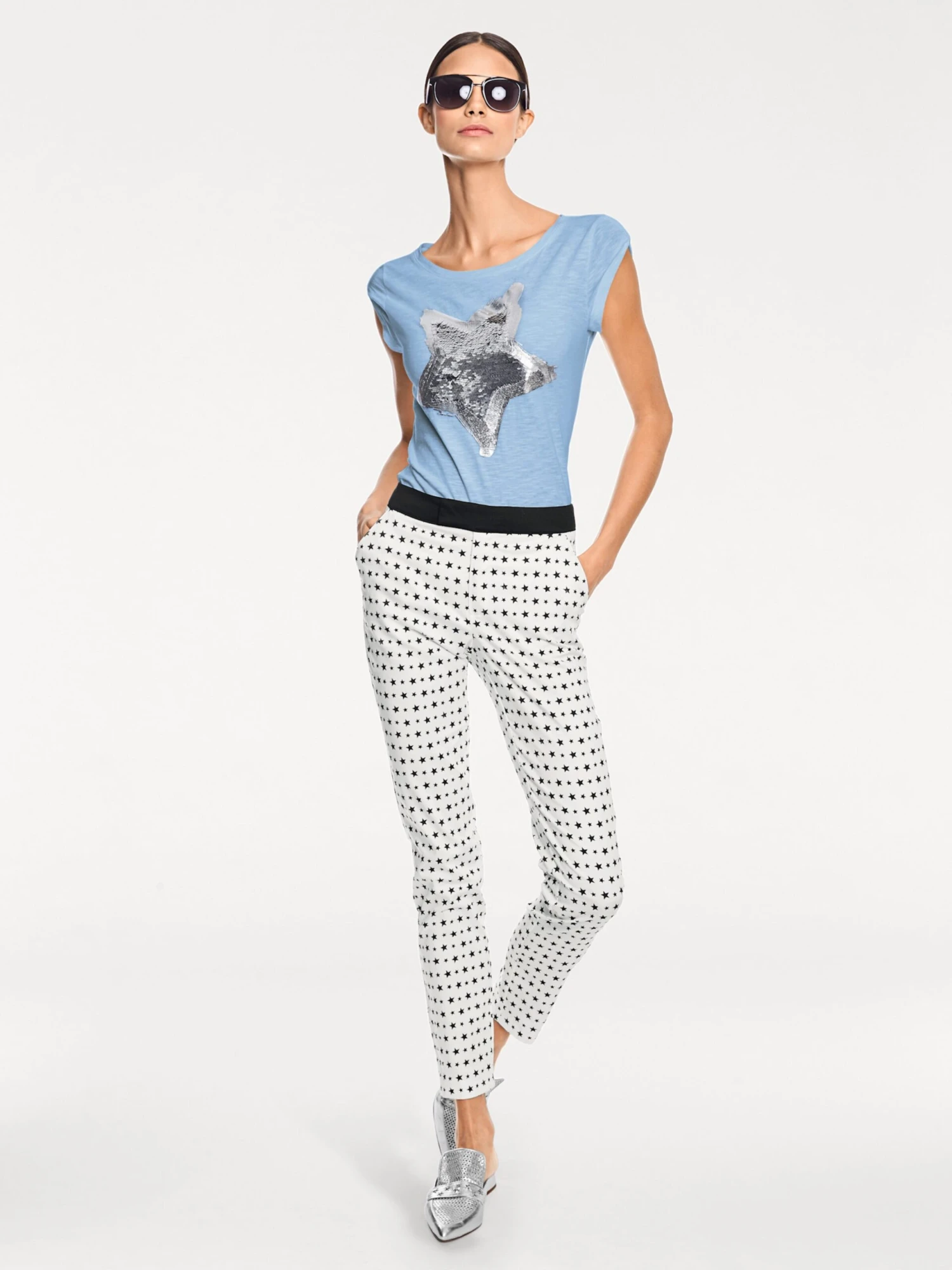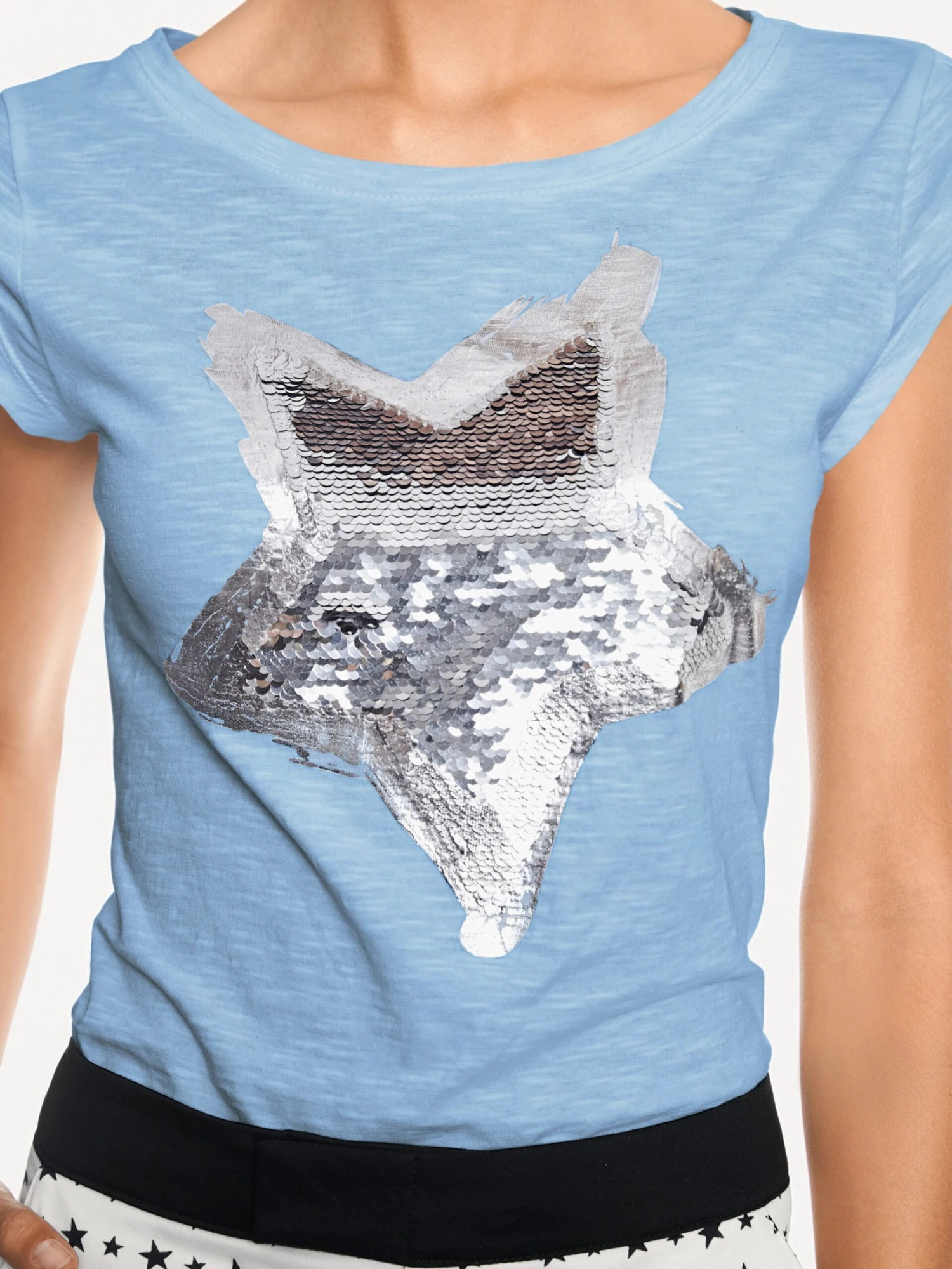 Rundhals-Shirts Mit angesagtem Pailletten-Besatz. Hoher Tragekomfort, pflegeleicht. Figurbetonte Form. Alltags- und bürotauglich. Mit Schlaufe am Ärmel.