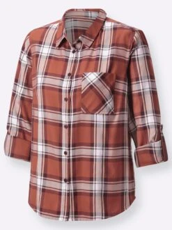 Im leicht rustikalen Look: Hemdbluse im garngefärbten Karodessin. Hemdkragen, 1 aufgesetzte Brusttasche. Lange Ärmel mit Riegel und Knopf zur individuellen Längenregulierung. Knopfmanschette. Brustabnäher, leicht gerundeter Saumabschluss. Rückenpasse mit Kellerfalte für zusätzliche Weite.