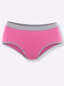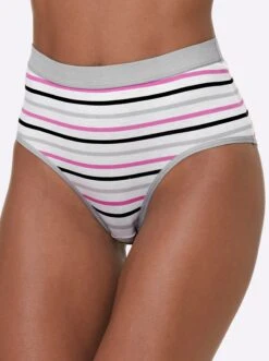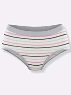 In der 4-Stück-Packung: Hüftslip von wäschepur. Sie bekommen zwei frech geringelte und zwei einfarbige Modelle. Mit breitem, elastischem Gummibund. Die Beinabschlüsse sind ebenfalls wunderbar elastisch. Doppelzwickel.