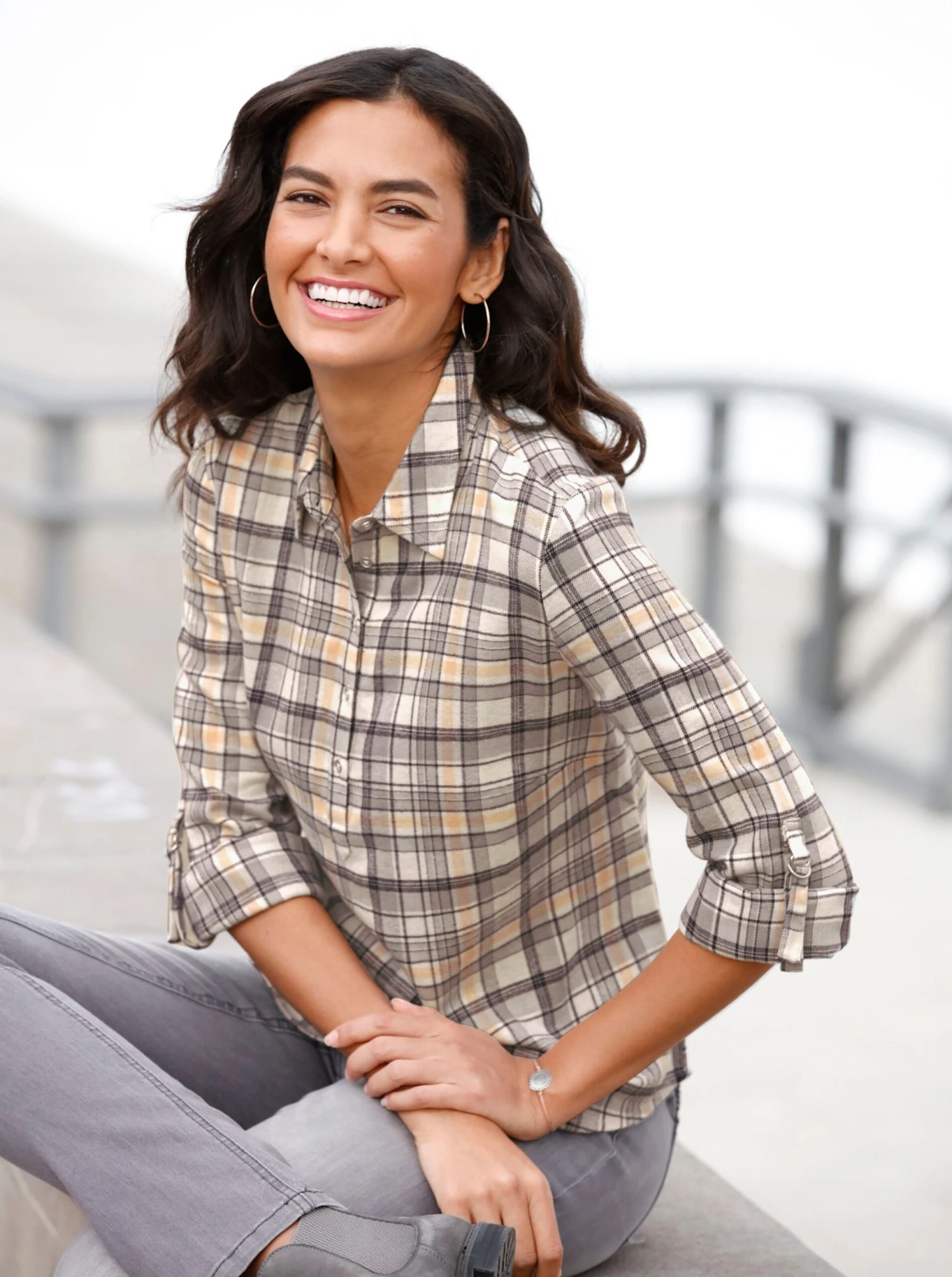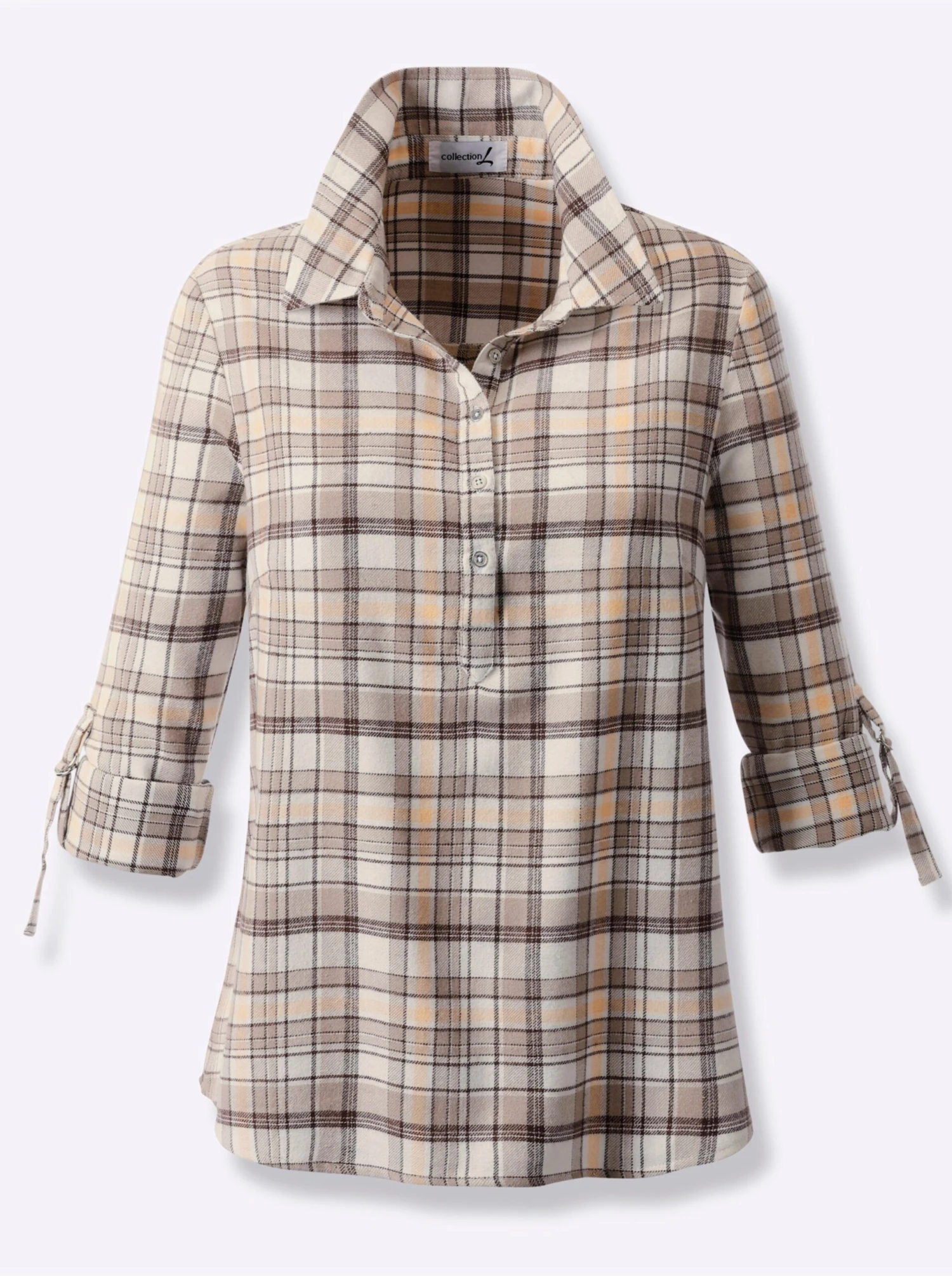 Die weich angeraute Flanell-Qualität macht diese Bluse zum lässigen Lieblingspartner! Im garngefärbten Karodessin. Lange Ärme, krempelbar auf 3/4-Länge. Brustabnäher, Knopfmanschette.