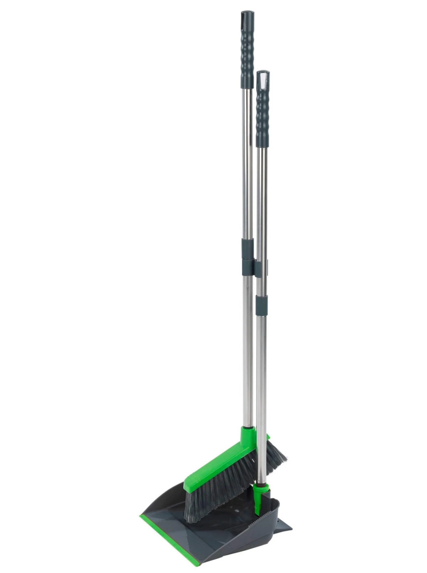 Praktische Kehrgarnitur, 2-tlg. für ein rückenschonendes Arbeiten. Handfeger und Kehrschaufel sind mit einem extra langen Stiel aus rostfreiem Edelstahl ausgestattet. Schmutz kann so einfach im Stehen aufgekehrt werden. Handfeger mit hochwertigem Bürstenkopf. Maß ca. 26×83,5×24 cm.
