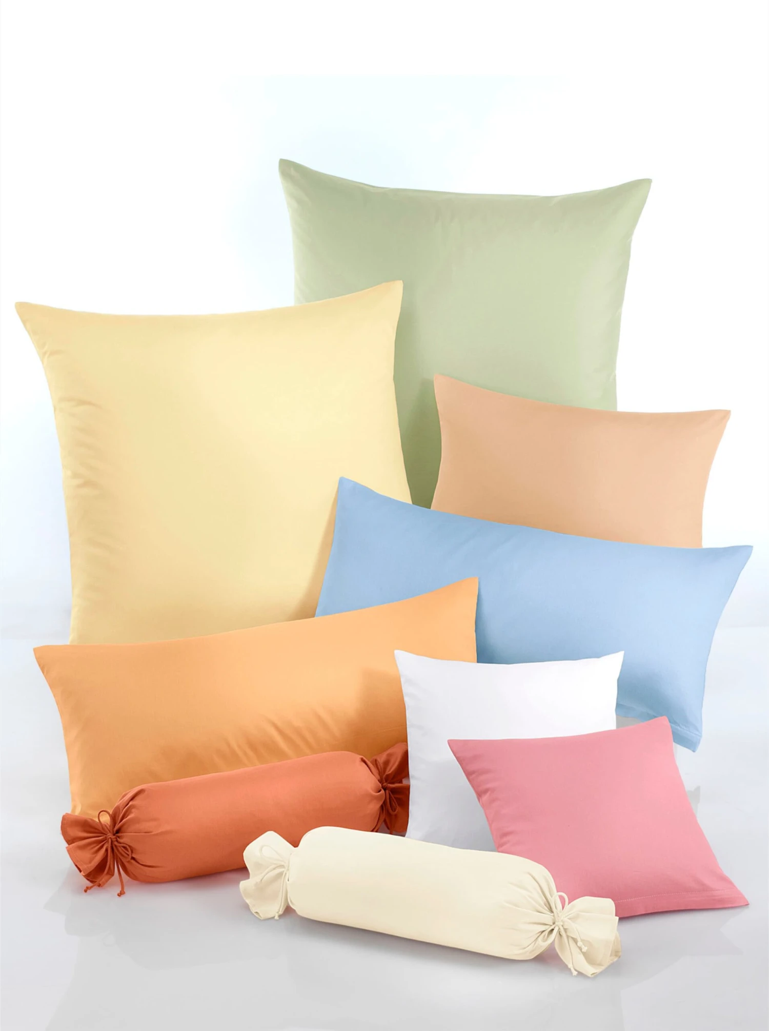 Kissenbezüge mit Knopfverschluss. Nackenrollenbezüge mit Bindebändern.