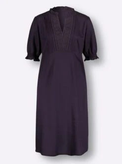 Um dieses tolle Kleid im hübschen, eingewebten Pünktchenmuster wird man Sie beneiden. Detailverliebte Verarbeitung mit Rüschenverzierung am kleinen Stehkragen und Lochstickerei entlang des offenen Vs. Die Biesen von den Schultern bis zur Taillennaht sind dekorativ und strecken optisch. Die Ärmel mit Smok-Abschlüssen sind an der Schulternaht gerafft und kaschieren so die Oberarme. 2 praktische Nahttaschen und die fließende Web-Qualität machen das Mode-Glück perfekt.
