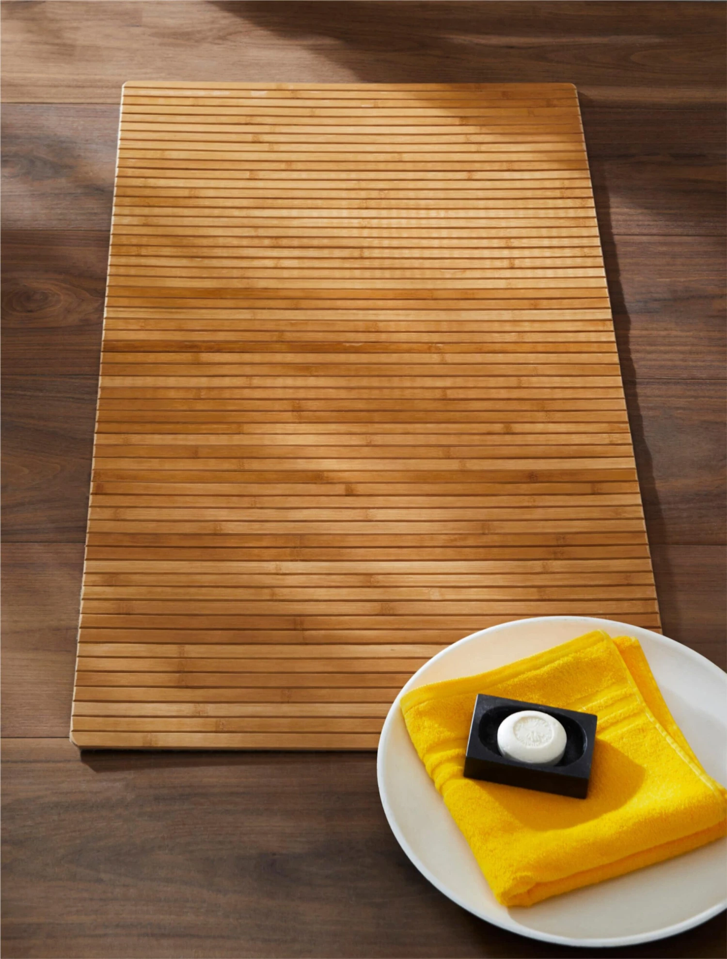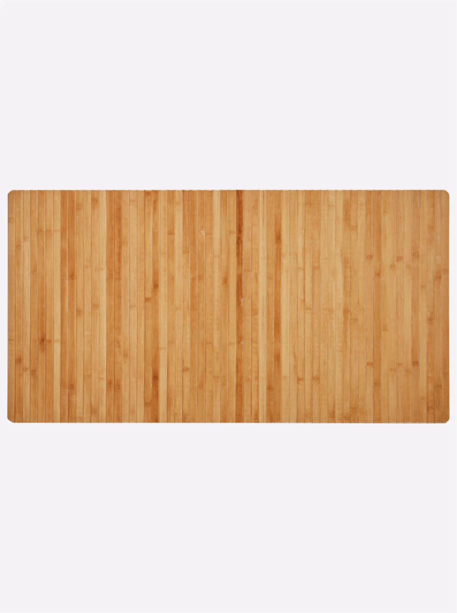 Badematte Aus Bambus, mit Vlies auf der Rückseite. Angenehmes Fußgefühl. Es handelt sich um ein Naturprodukt, Farbabweichungen möglich. Einfache Reinigung durch absaugen, ausklopfen oder feucht abwischen. Für Fußbodenheizung geeignet.