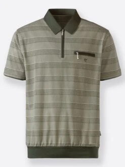 Die Klima-Anlage auf der Haut! Kurzarm-Poloshirt in temperatur-ausgleichender stay fresh-Qualität von Hajo. Allover im aufwändigen Jacquard-Streifen mit dekorativer Pegasus-Stickerei vorne. Die Details: Polokragen, verdeckter Reißverschluss mit Paspelierung und eingearbeitete Brusttasche mit Reißverschluss. Gerippte Bündchen an den Ärmeln und am Saum. Single-Jersey.