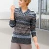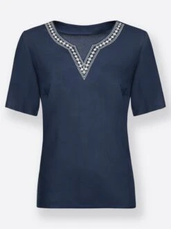 Die hübsche Kontraststickerei und die schimmernden Zierplättchen setzen diese Bluse geschickt in Szene! Modischer Rundhals-Ausschnitt mit kleinem V.