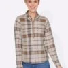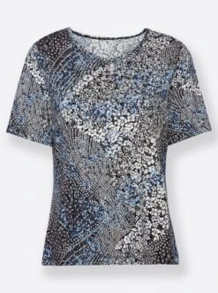 Weich fließendes Shirt im kombistarken Druck-Dessin. Mit kleinem Schlitz und dekorativen Glitzersteinchen am Rundhals-Ausschnitt. Kurze Ärmel.