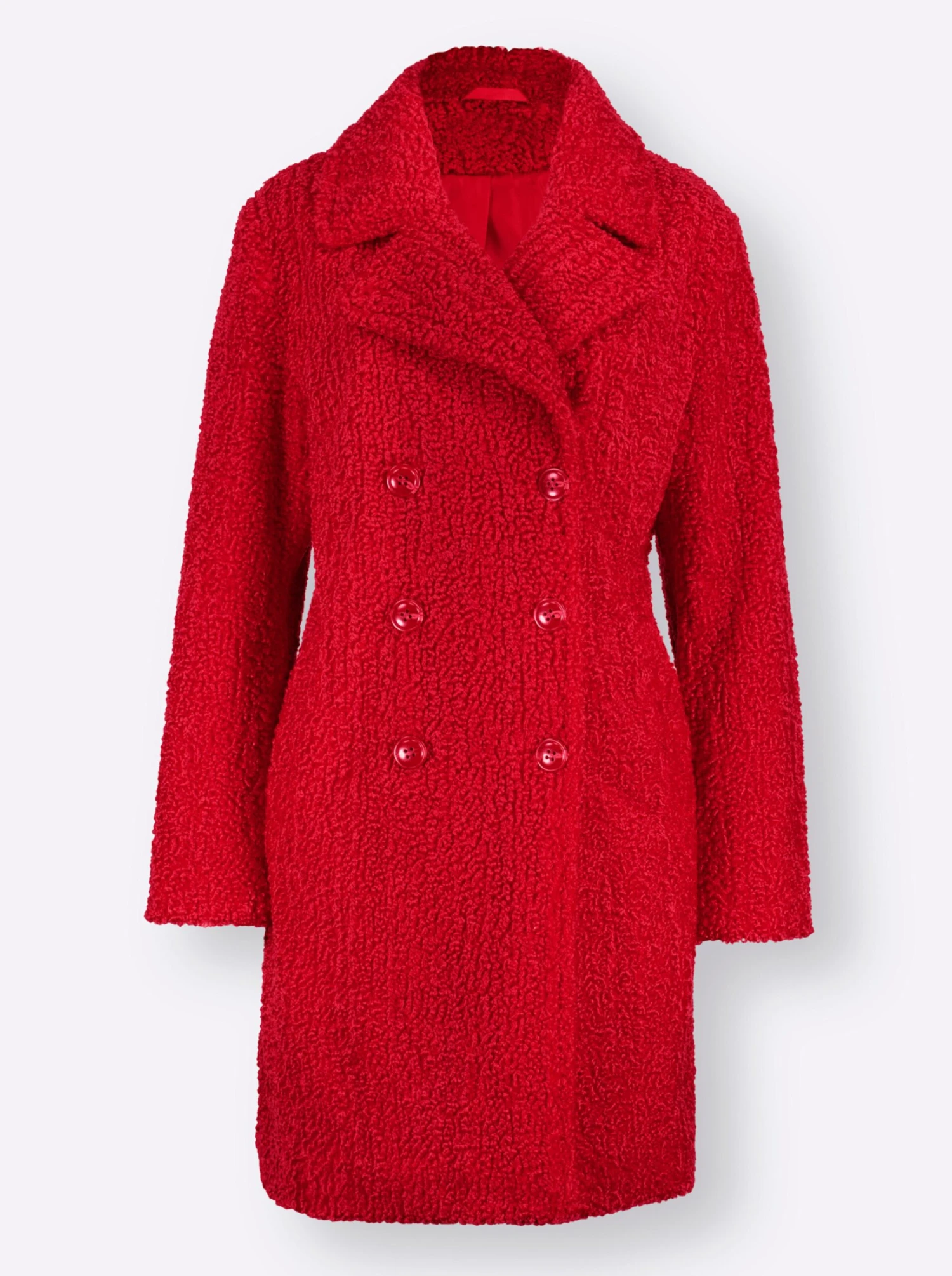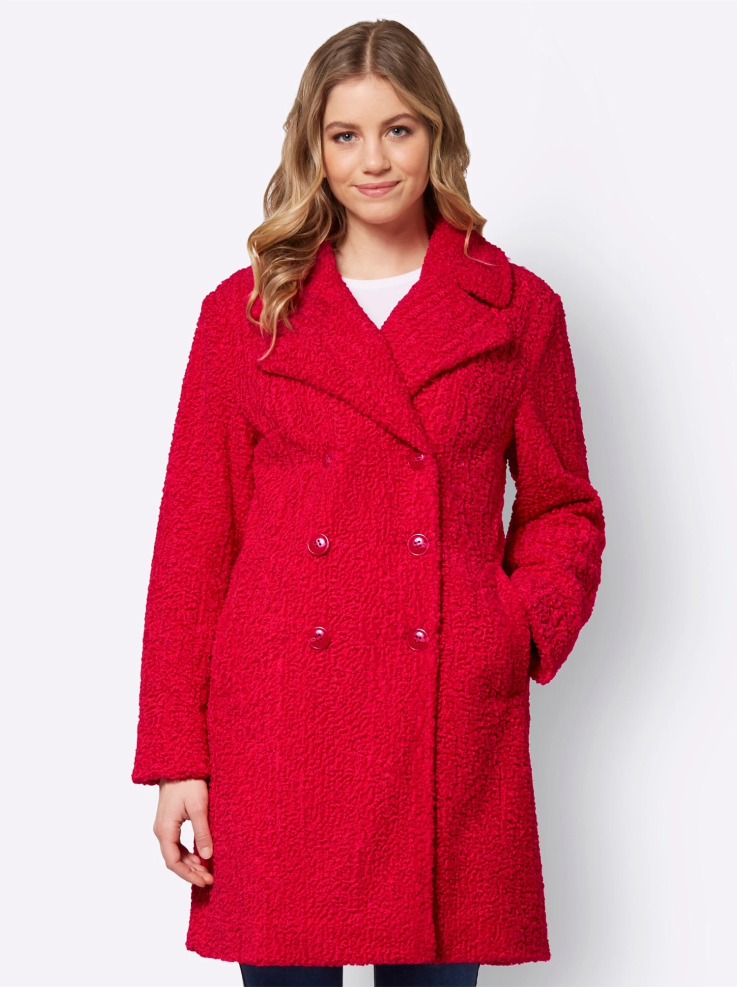In diesem super kuscheligen Mantel aus Bouclégarn wird Ihnen bestimmt warm ums Herz! Mit Umlegekragen und durchgehender, zweireihiger Knopfleiste. 2 Taschen sowie 1 praktische Innentasche. Schön locker geschnitten umspielt er geschickt die Figur.
