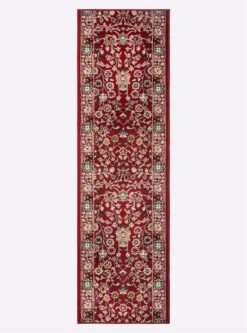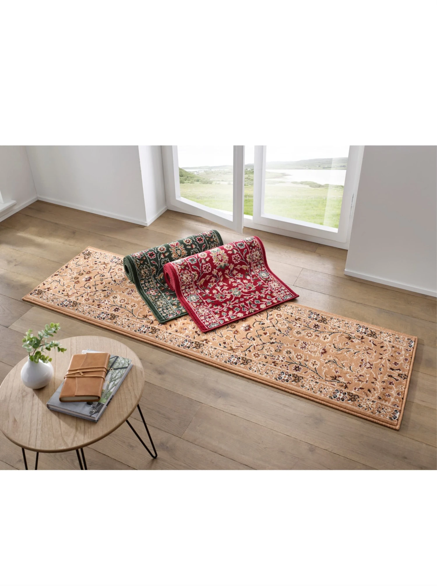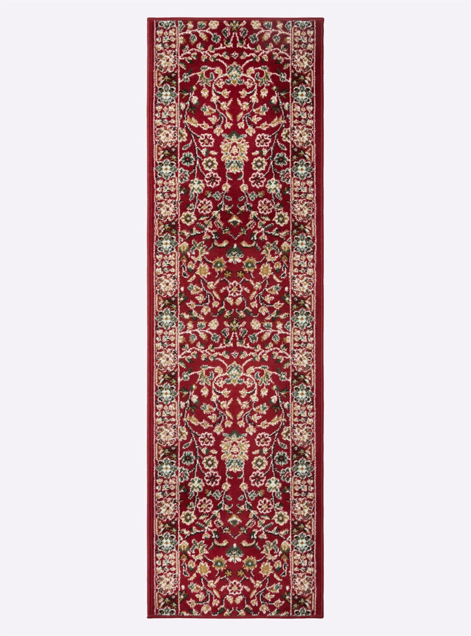 Eingefasst mit einer breiten Bordüre. Ein aufwändig gestaltetes, opulentes Blütendessin rankt sich auf diesem pflegeleichten Kurzflor-Teppich-Programm. Maschinell gefertigt, Abschlüsse ringsum gekettelt. Höhe ca. 8 mm.
