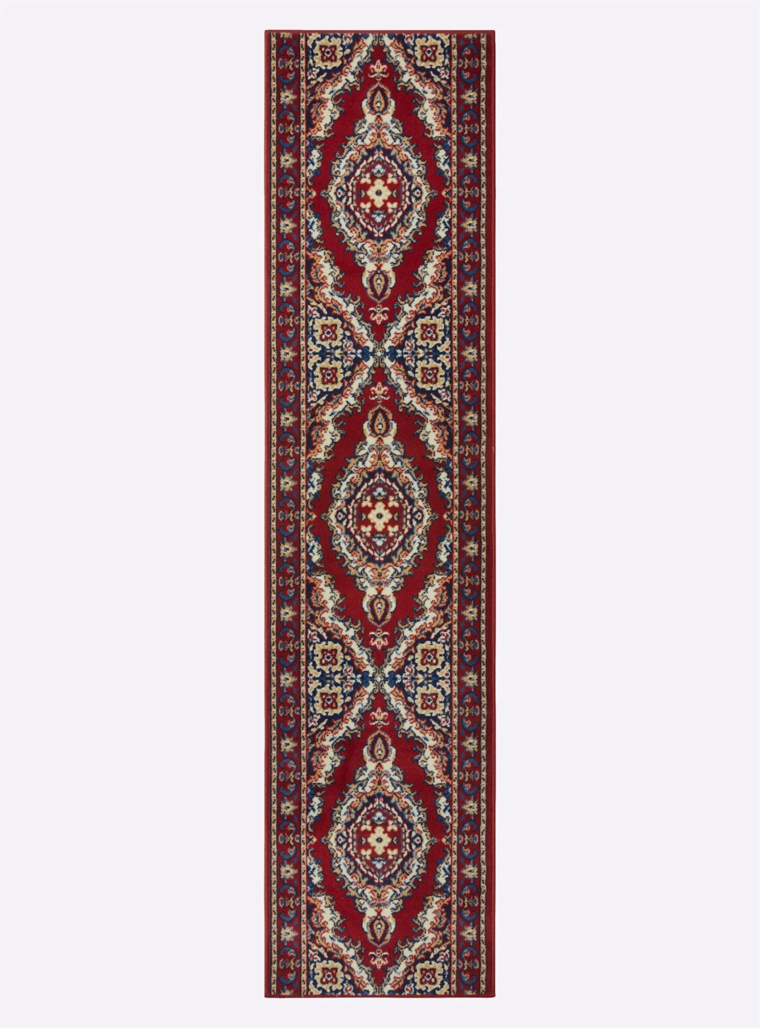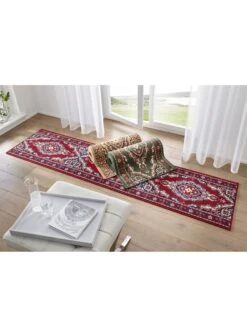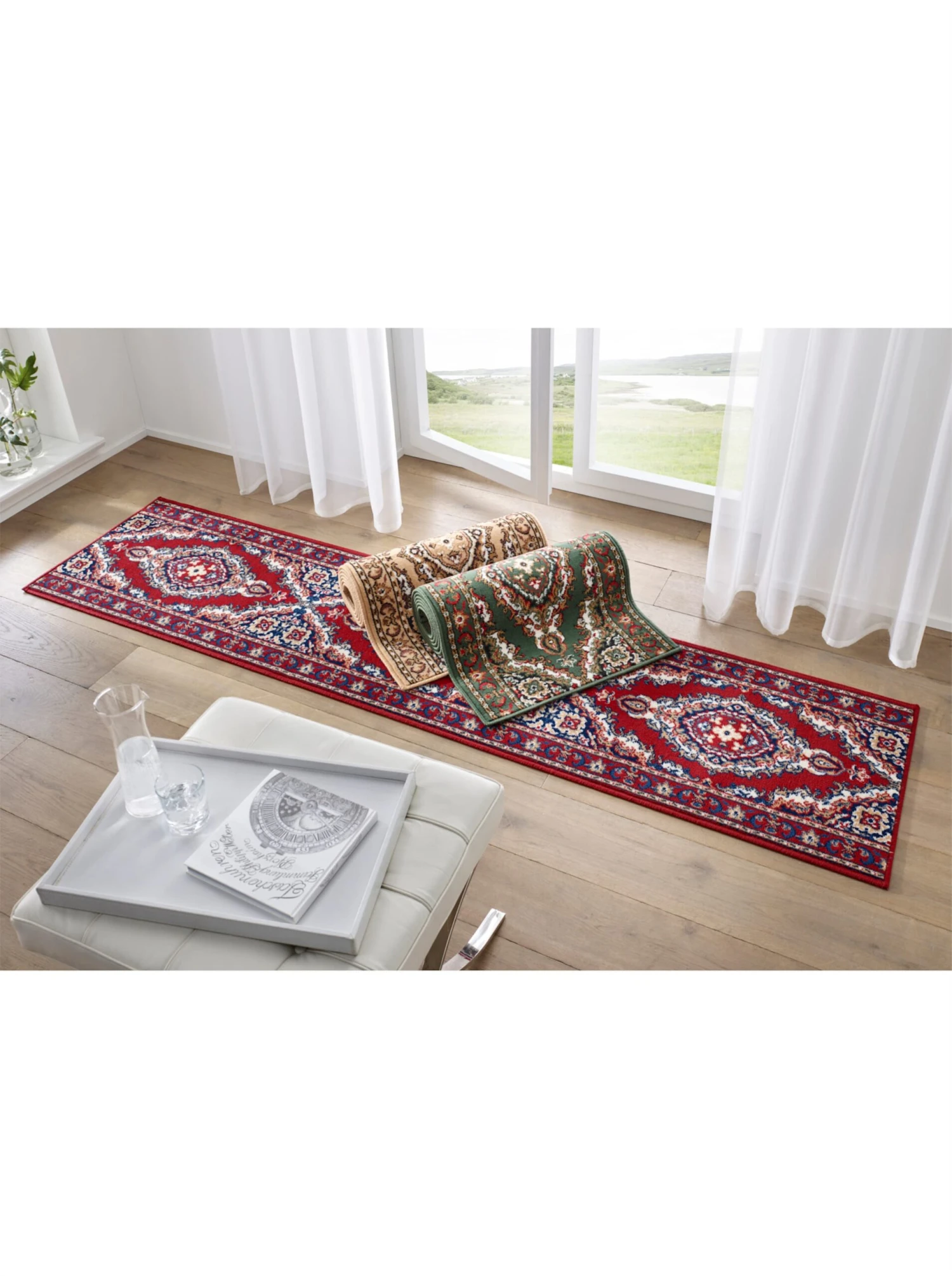 Ein echter Klassiker im aufwändigen Ornamentdessin: Kurzflor-Teppich-Programm in unempfindlicher Qualität. Maschinell gefertigt, Abschlüsse ringsum gekettelt. Höhe ca. 8 mm.