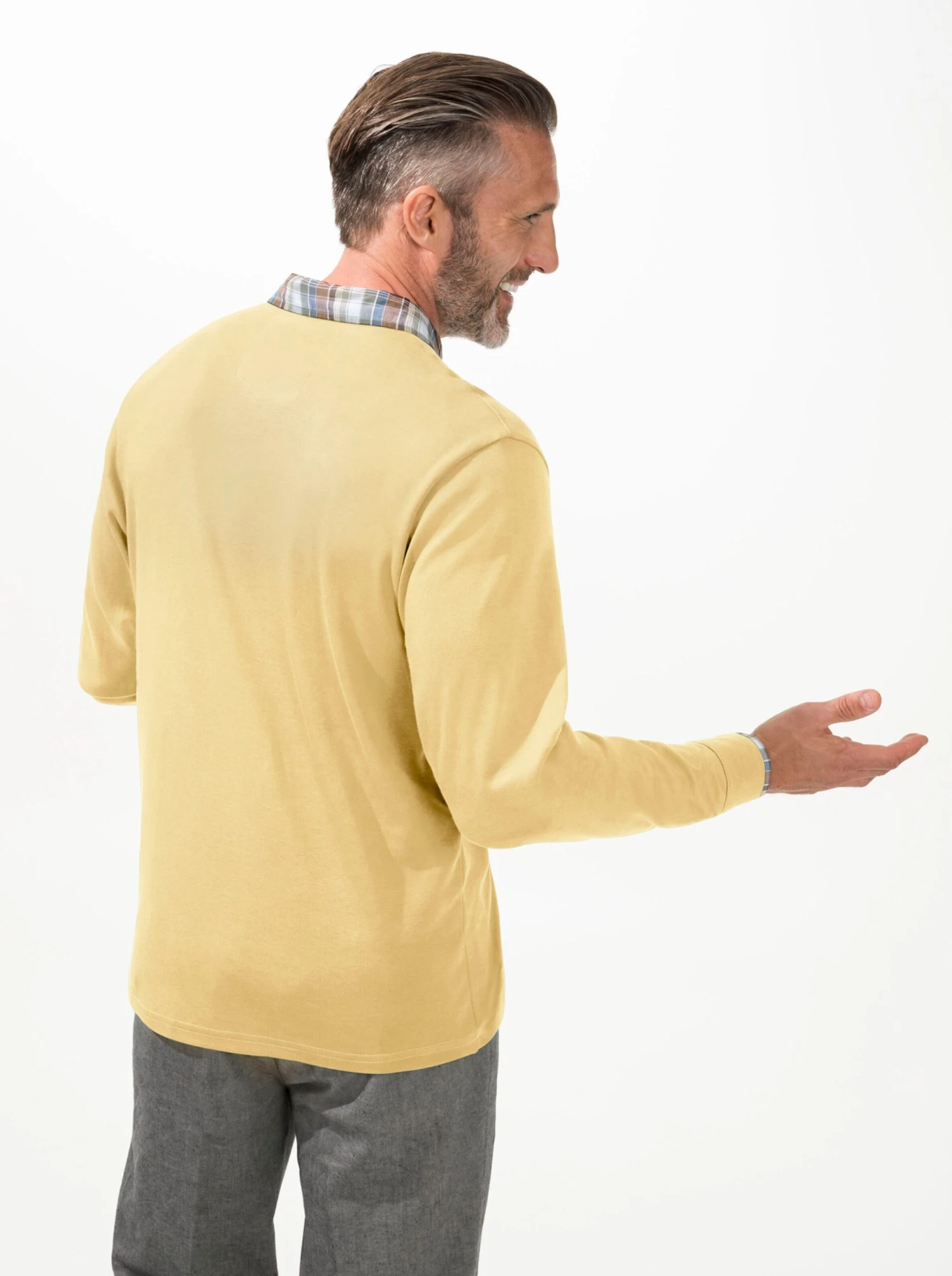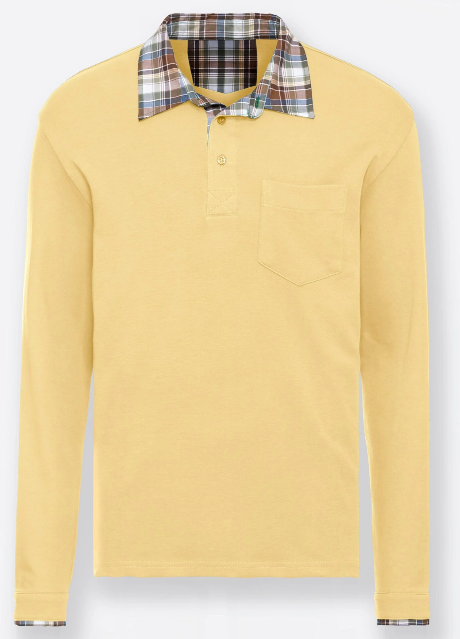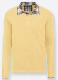 Zwei in einem! Sieht aus, als hätten Sie ein Karohemd unter ein Shirt gezogen, dabei ist der Webkaro-Kragen und die Karo-Manschette mit Knopfverschluss aufwändig angenäht. So sitzt bei diesem Langarm-Poloshirt mit Knopfleiste und Brusttasche immer alles an der richtigen Stelle, nichts trägt auf. Hautsympathische Qualität.