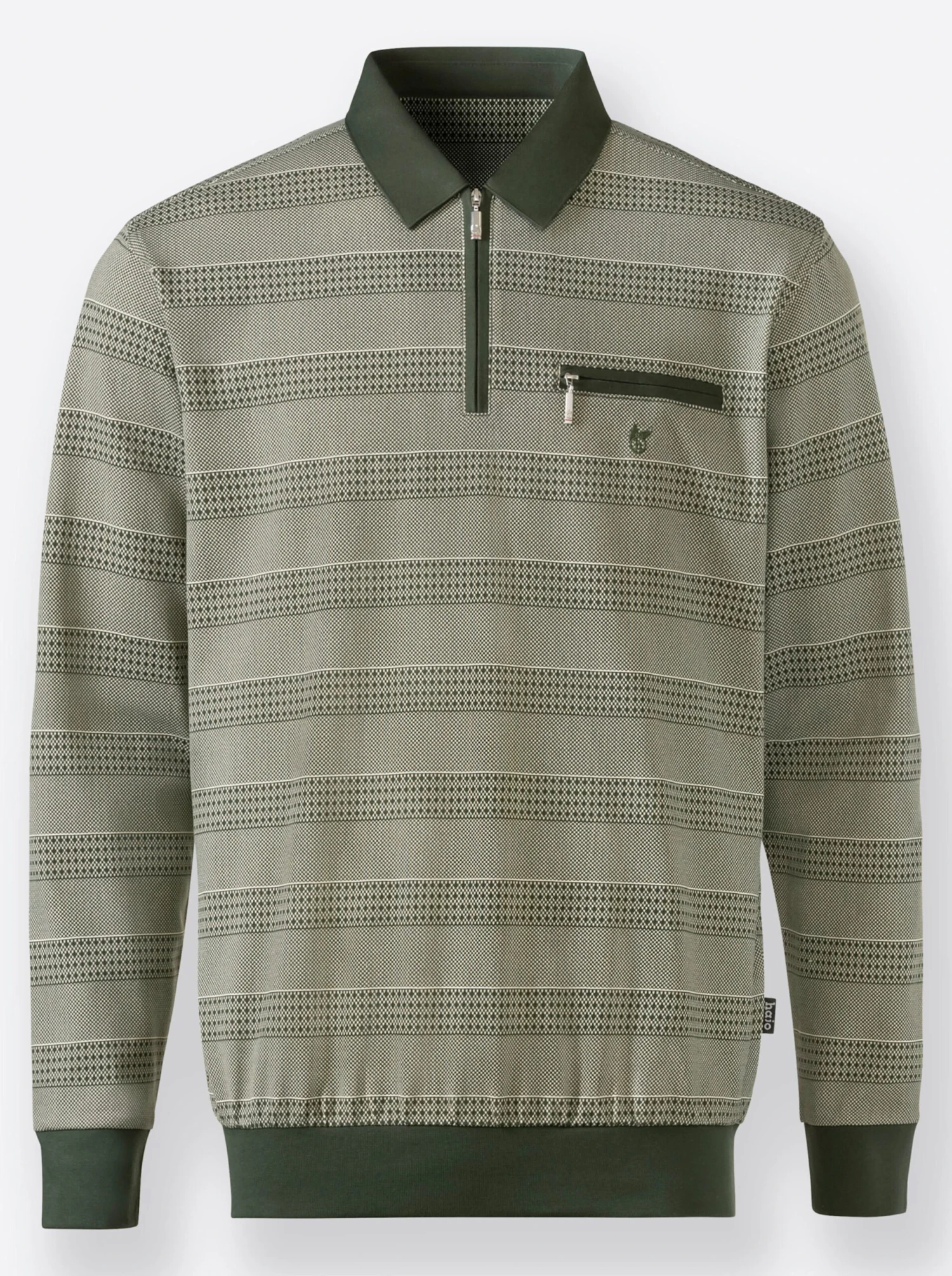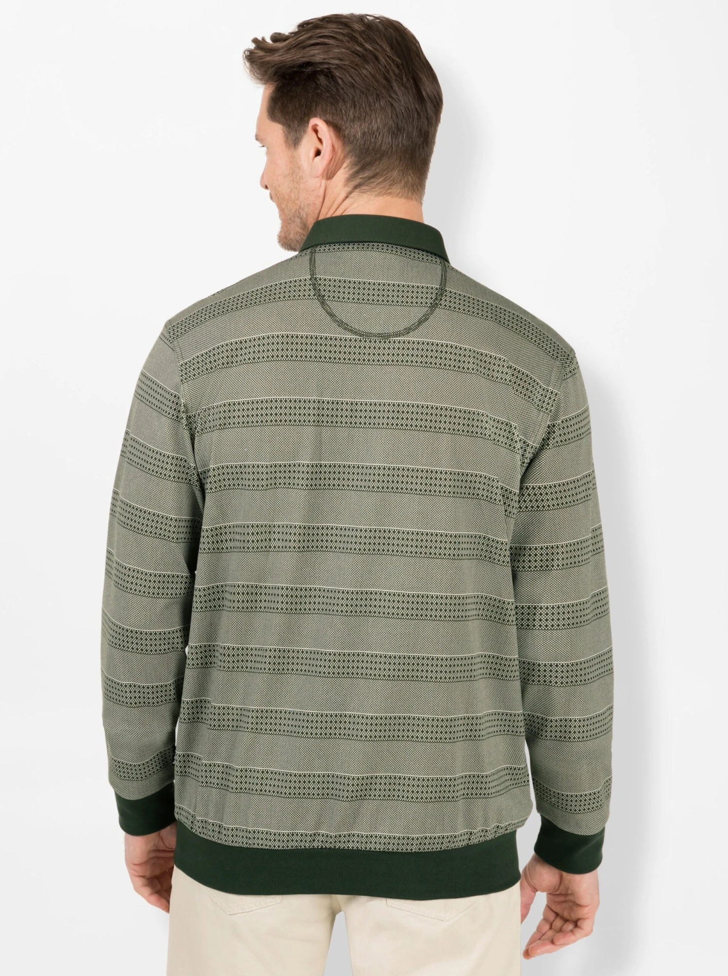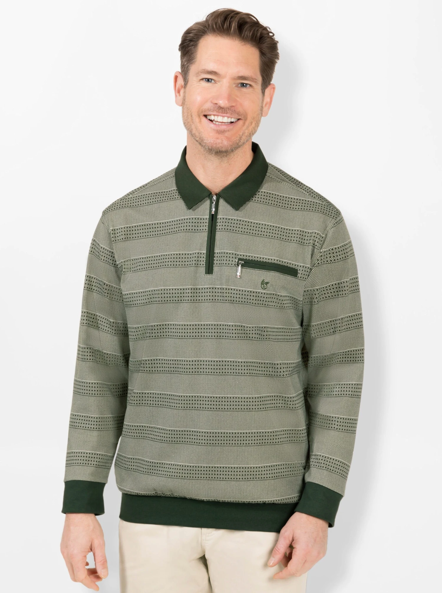 Im farbharmonischen Streifen-Jacquard! Langarm-Poloshirt in trageangenehmer und klimaausgleichender stay fresh-Qualität von Hajo. Mit Polokragen und verdecktem Reißverschluss mit Paspel. Eingearbeitete Brusttasche mit Reißverschluss. Dekorative Pegasus-Stickerei vorne. Passformfreundliche Schulterpasse. Gerippte Bündchen an den Ärmeln und am Saum. Single-Jersey.