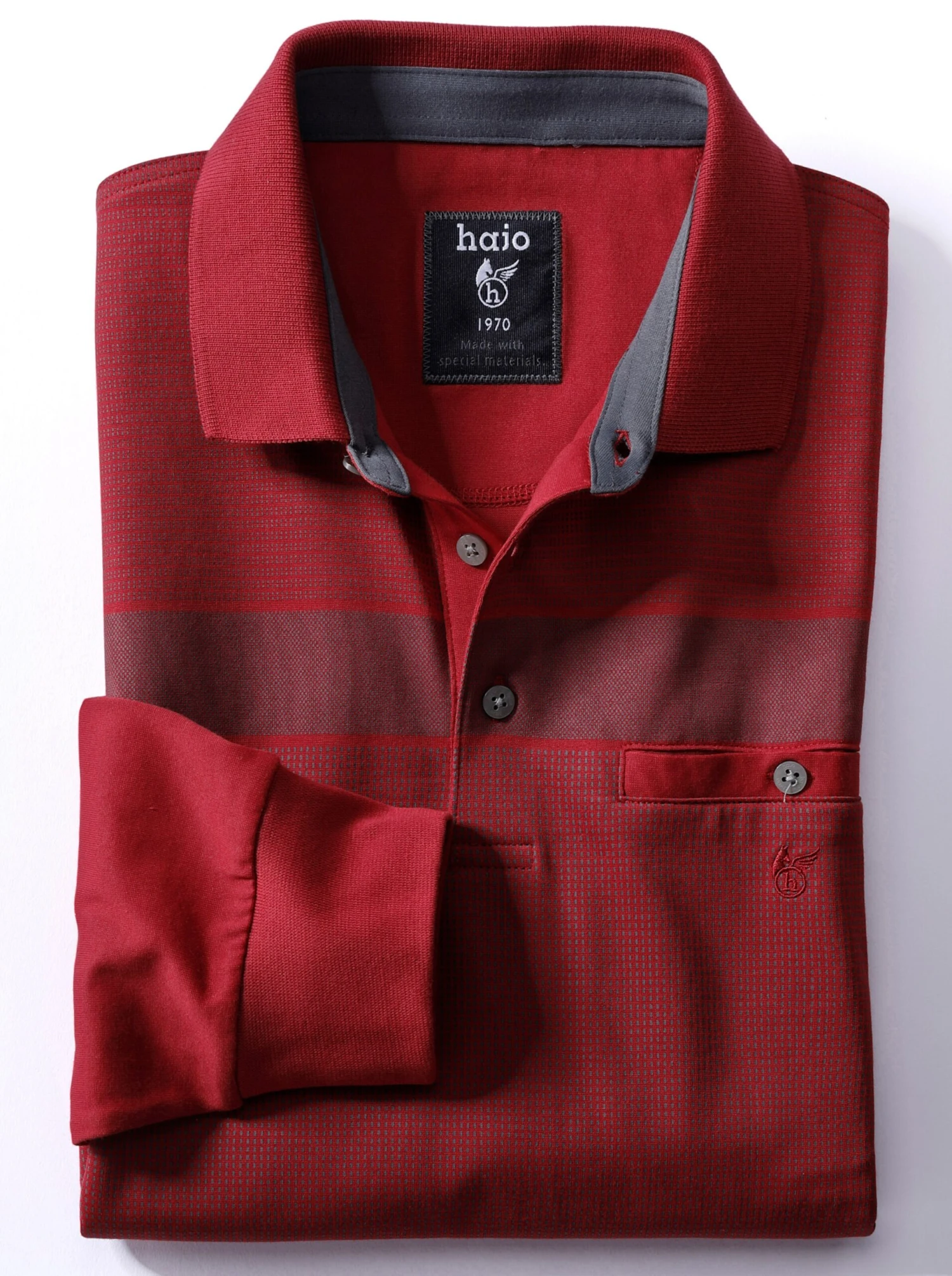 In bewährter STAY FRESH-Qualität: Zeitloses Langarm-Poloshirt von hajo mit Streifen-Druck im Vorderteil. 1 Brusttasche mit Knopf. Komfortable Bündchen an Ärmeln und Saum. Hochwertige Klima-Komfort-Faser.