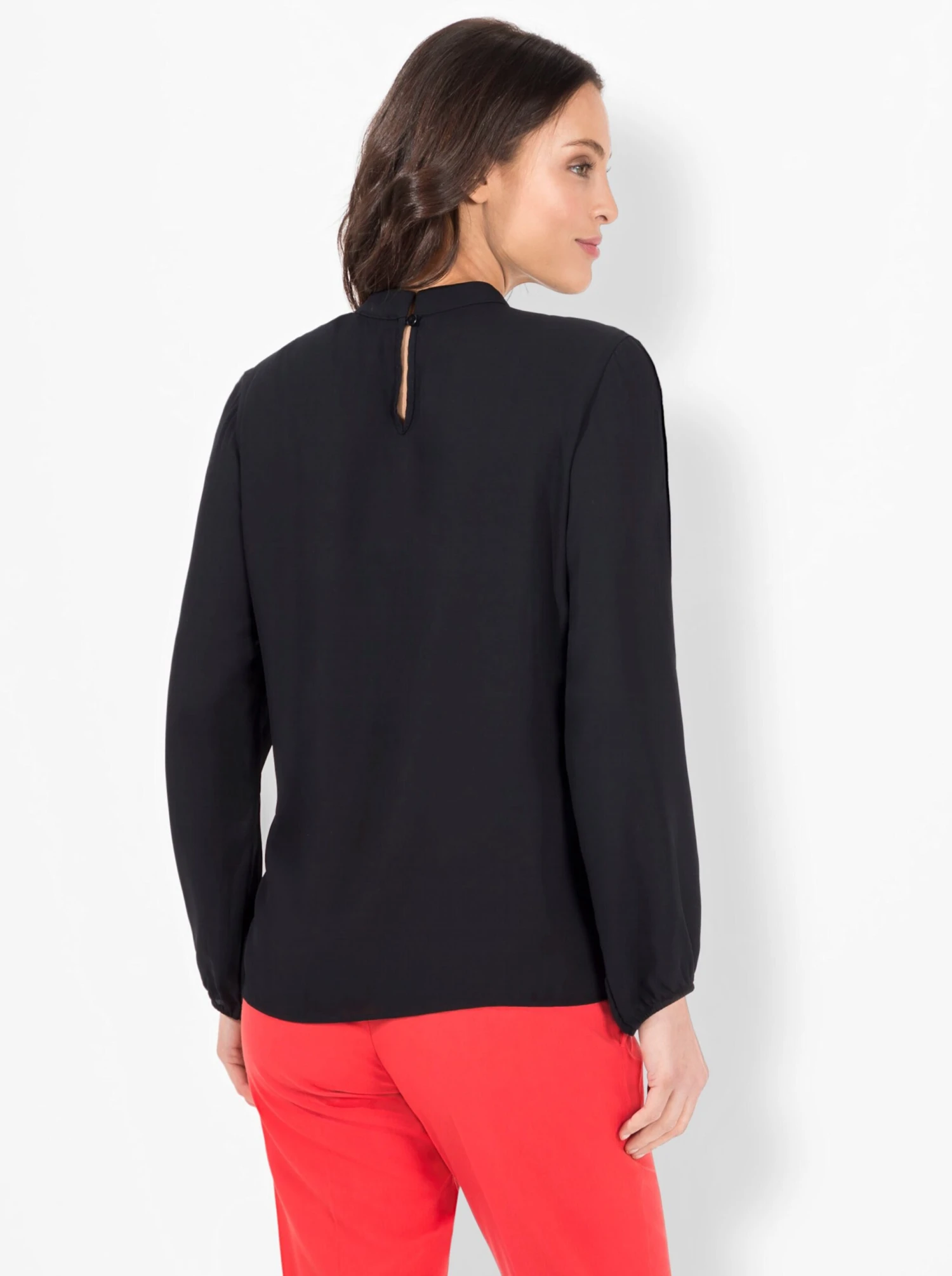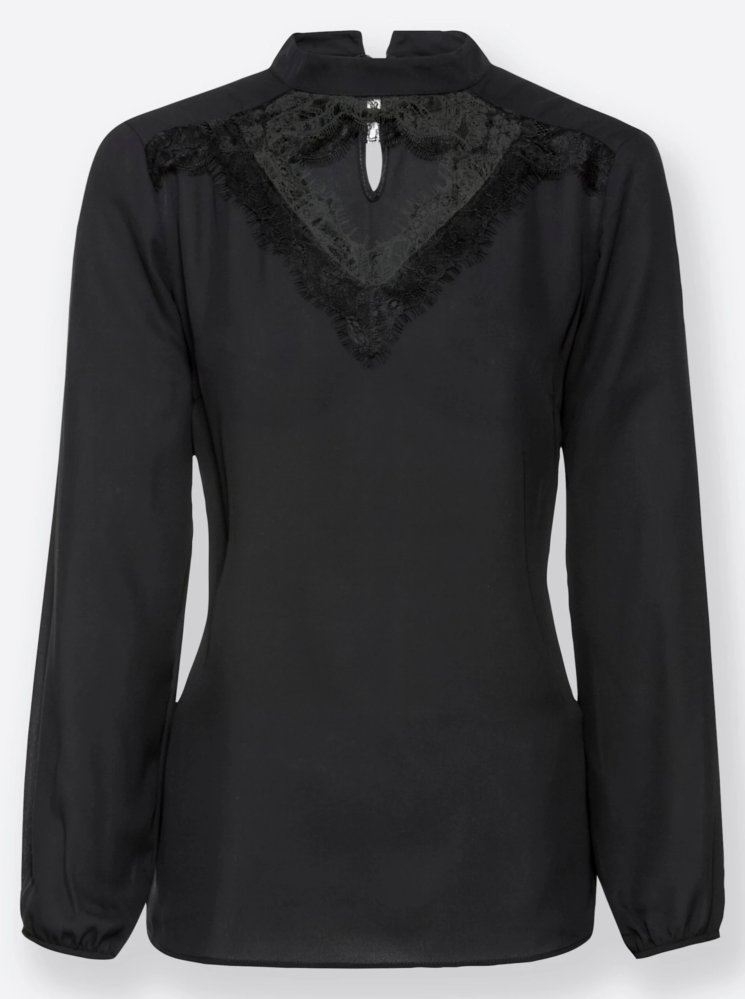 Oh là là! Die Bluse macht durch ihren raffinierten Ausschnitt viel her. Unter dem Stehkragen ist ein tiefer, offener V-Ausschnitt angesetzt, der von Spitze umrahmt wird. Im Nacken mit Knopfverschluss. Lange Ärmel mit Gummibündchen.