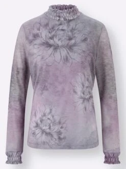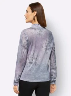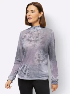 Zauberhaftes Shirt mit platzierten Blütenmotiven auf der Vorderseite. Der Stehkragen und die Bündchen der langen Ärmel sind mit weichem Gummizug gesmokt. Trageangenehme Viskose-Mischung mit zartem Flammgarn-Effekt, der eine typische Struktur in den Stoff zaubert.