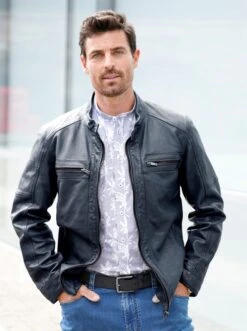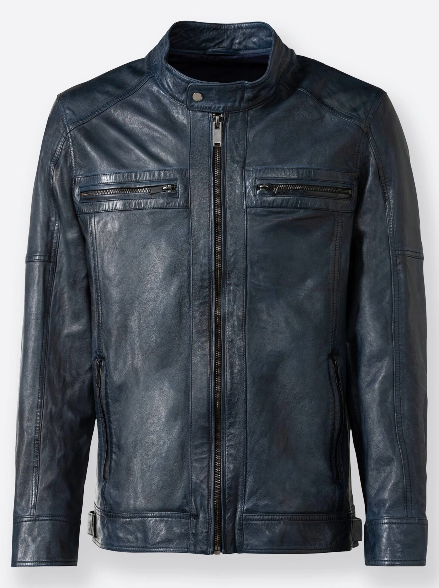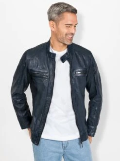 Ein Teil für die Ewigkeit – und das zu einem mega Preis-Leistungs-Verhältnis! Die Leder-Jacke in hochwertiger Qualität sieht jetzt schon grandios gut aus, gewinnt aber mit dem Alter noch an Charme dazu. Moderner Look mit Stehkragen mit kleinem Riegel, durchgehendem Reißverschluss sowie 2 Brusttaschen und 2 seitlichen Taschen jeweils mit Reißverschluss. 2 zusätzliche Innentaschen. Ärmel und Saum sind dank Druckknöpfen bzw. knöpfbaren Riegeln in der Weite verstellbar. Von Marco Donati.