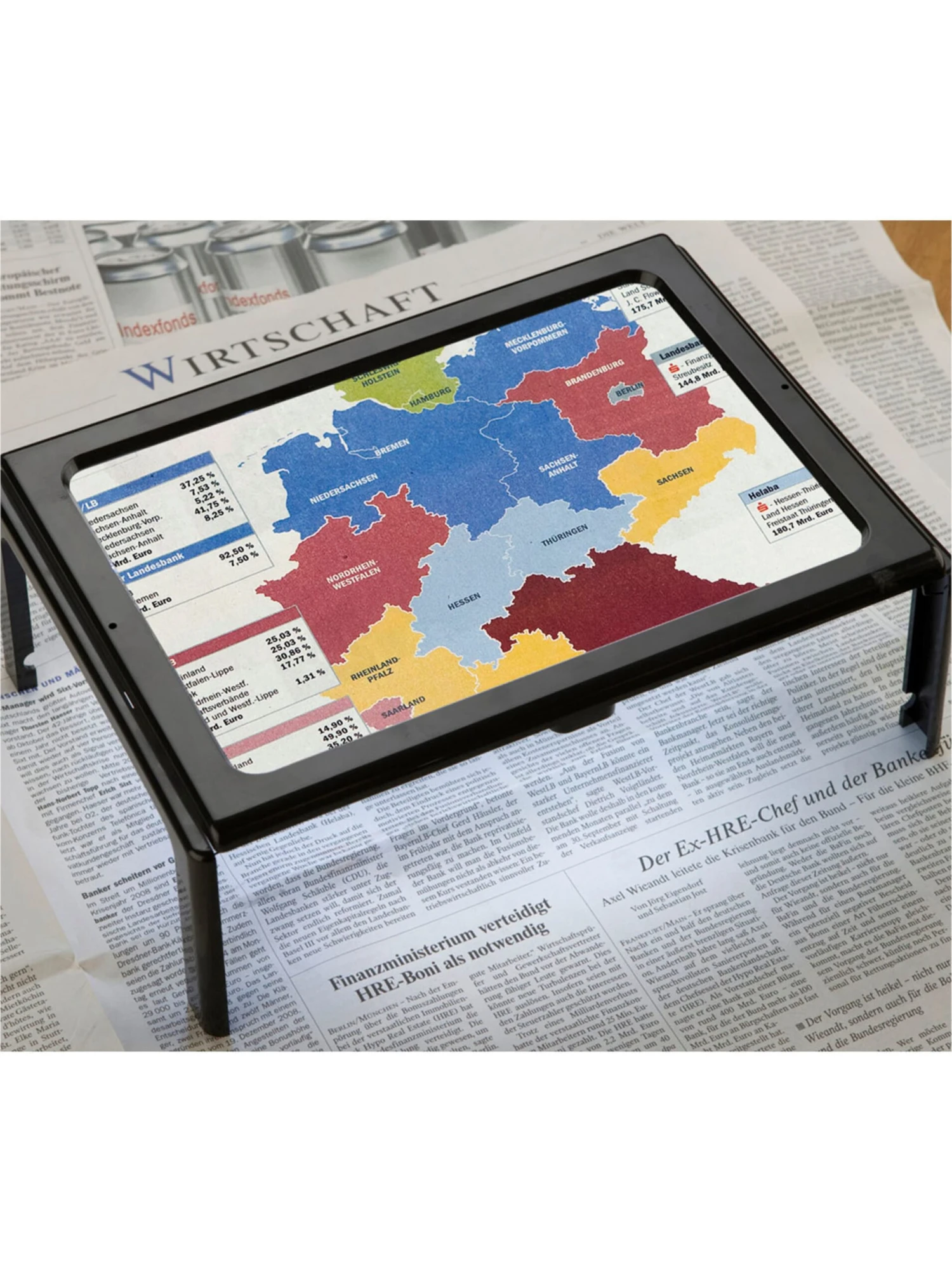 Verhilft Kleingedrucktem zu wahrer Größe: Die Leselupe mit Licht vergrößert um 300%! 4 LEDs an der Unterseite des Rahmens spenden reichlich Licht. Maße ca. 30x11x18 cm. Rahmen ABS, Lupe Kunststoff. Batterien 2×1,5V AAA nicht im Lieferumfang enthalten.
