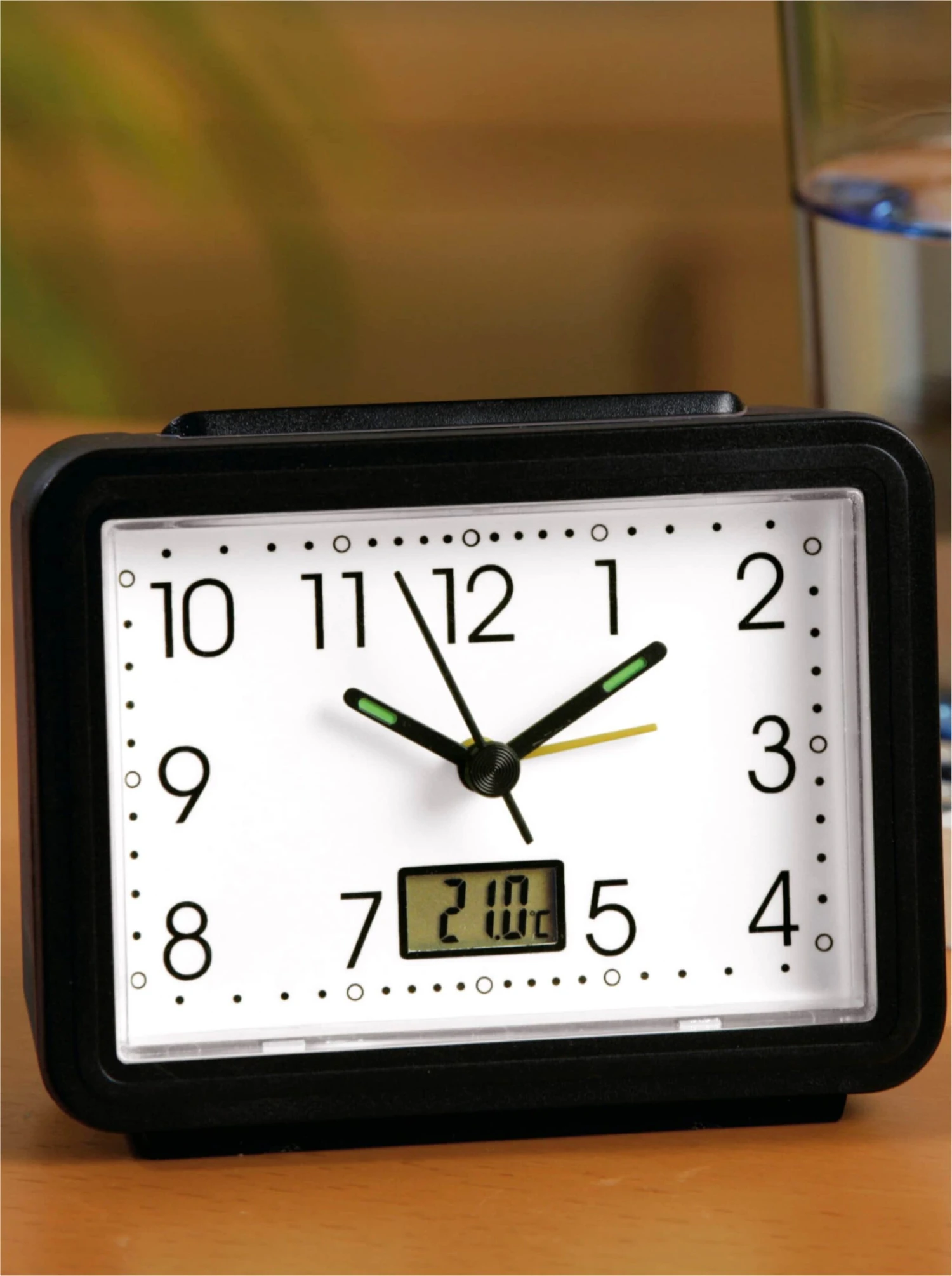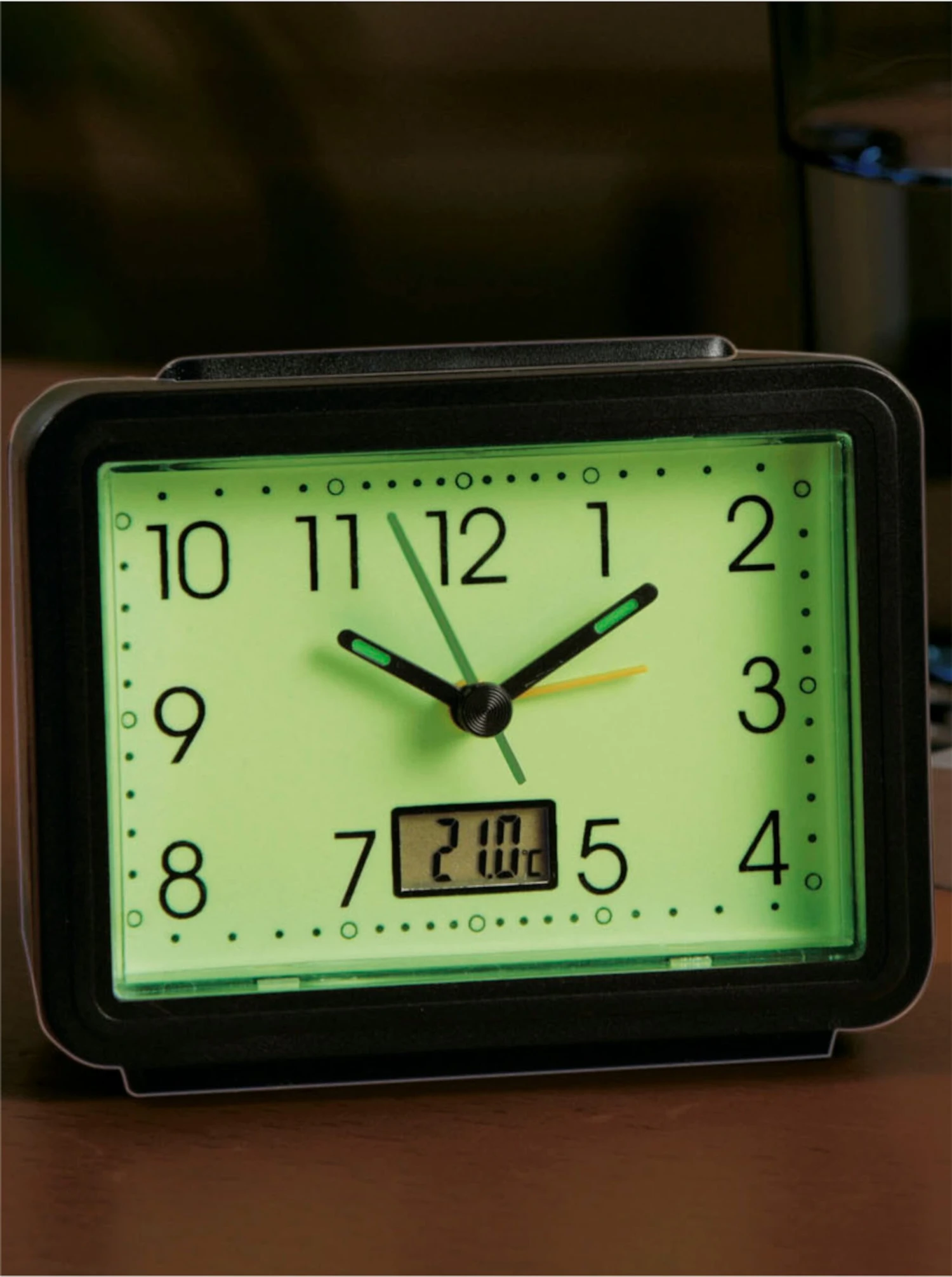 Leucht-Wecker mit phosphoreszierendem Ziffernblatt und Temperaturanzeige. Maße ca. 11x5x8,5 cm. Lieferung ohne Batterien.