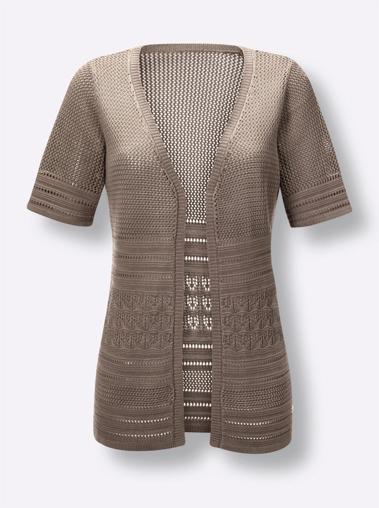 Sanft zur Haut, angenehm kühl im Tragegefühl durch den exklusiven Materialmix: Lyocell-Strickjacke im luftigen Ajourmuster. Offene Form mit breiter, umlaufender Rippblende.