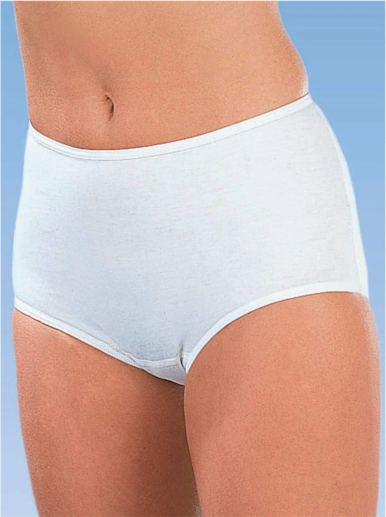 Monatshöschen und Hygiene-Slip. Plastikeinlage, Gummiabschlüsse an Bund- und Beinausschnitten. 100% Baumwolle. Feinripp.