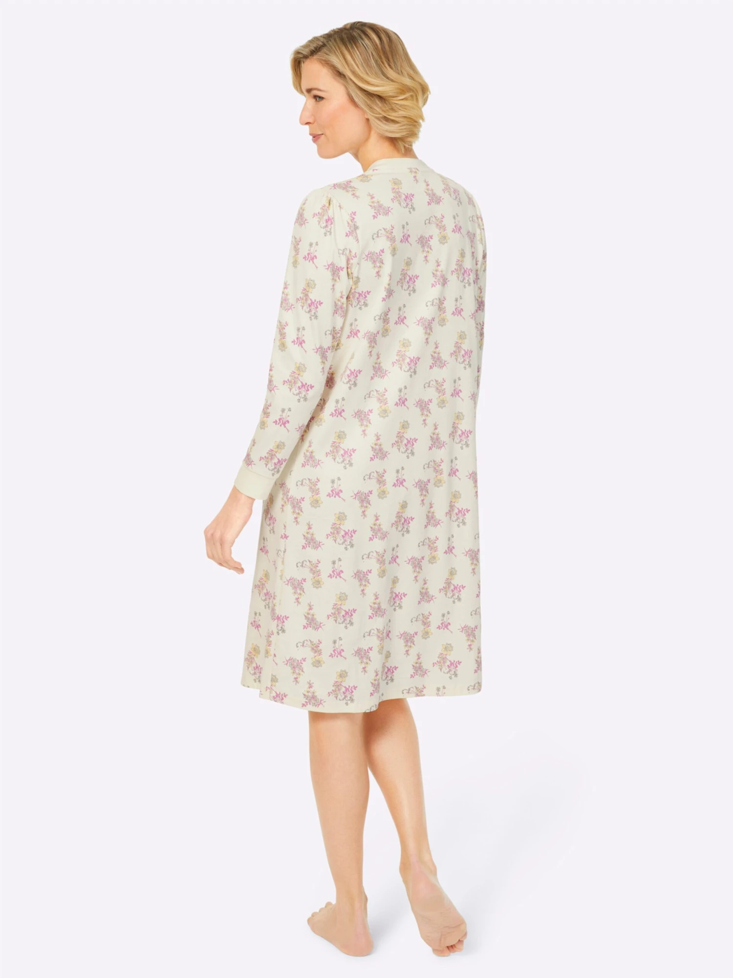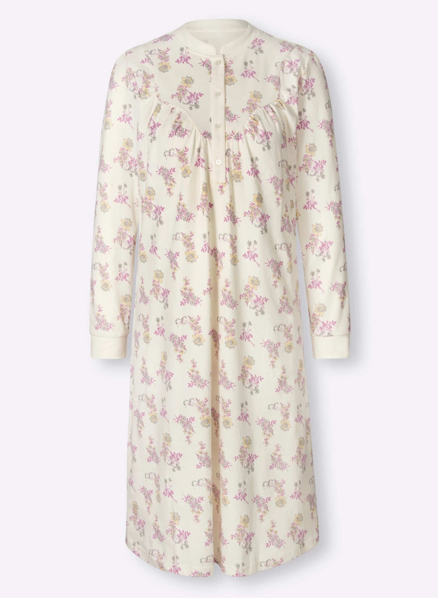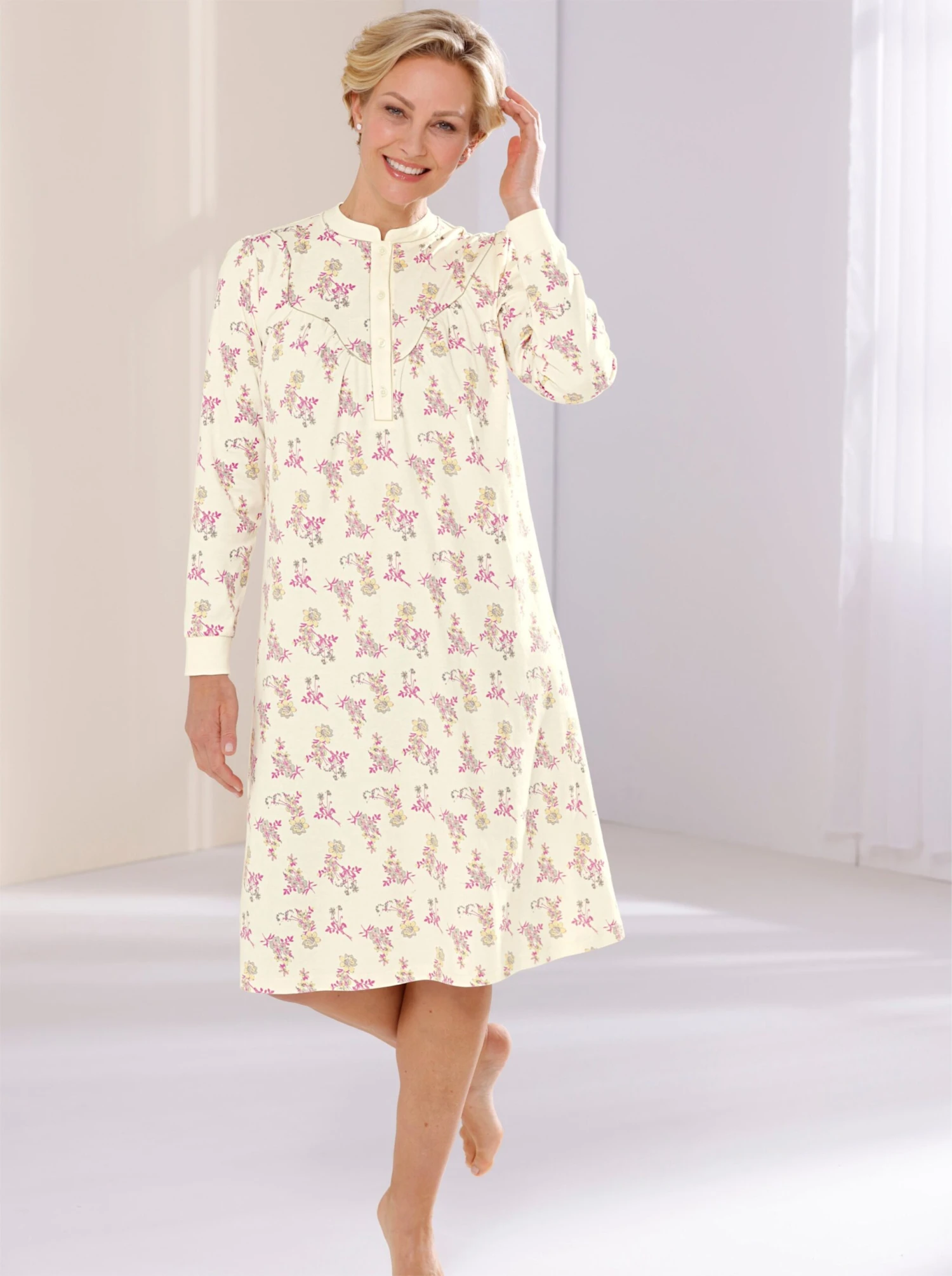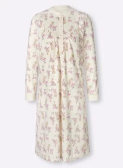 Im trageangenehmen, formstabilen Interlock-Jersey: Nachthemd im aparten Blümchen-Dessin. Kleiner Stehkragen, lange Knopfleiste. Lange Ärmel mit Rippbündchen. Unterstützt die Initiative Cotton made in Africa.