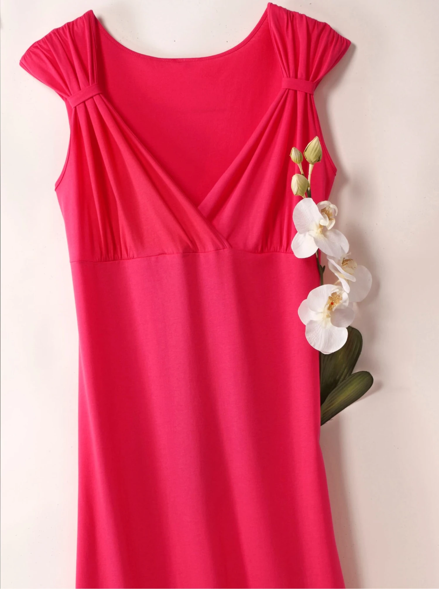 Zeitlos schönes, ärmelloses Nachthemd mit besonderen Details: klassischer V-Ausschnitt mit raffiniertem Wickel-Effekt. Breite Träger mit schöner Raffung. Single-Jersey.