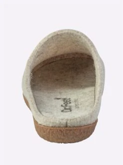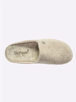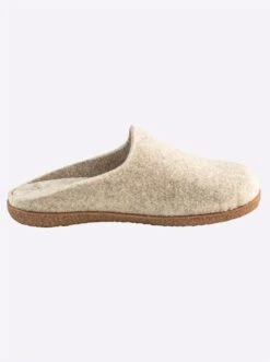 Pantolette aus Filz. Innensohle aus Wolle. Herausnehmbares Fußbett. Rutschhemmende Laufsohle. Absatzhöhe ca. 25 mm (bei Gr. 37). Weite F.